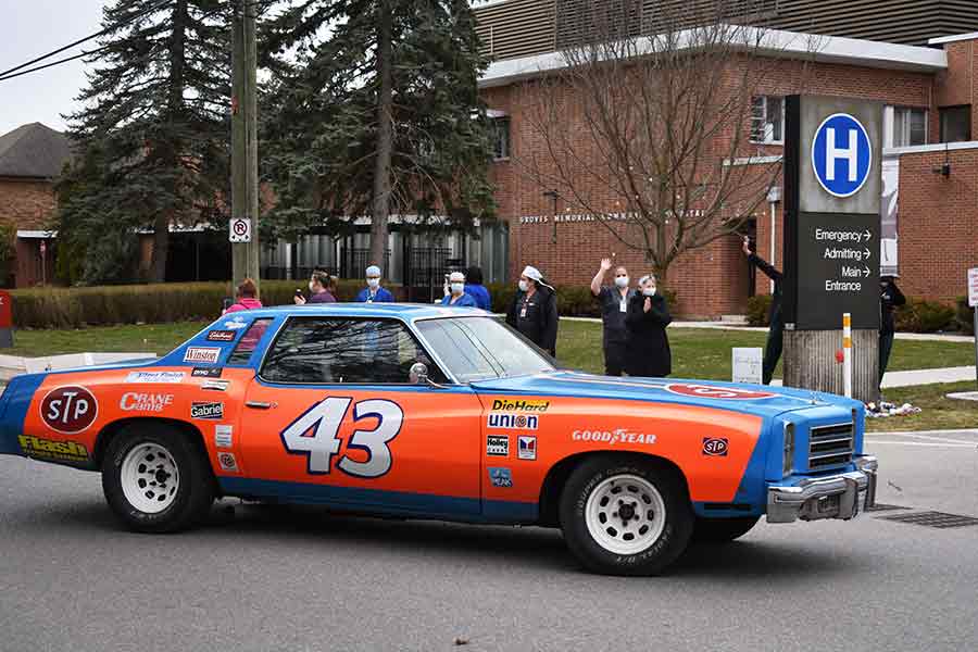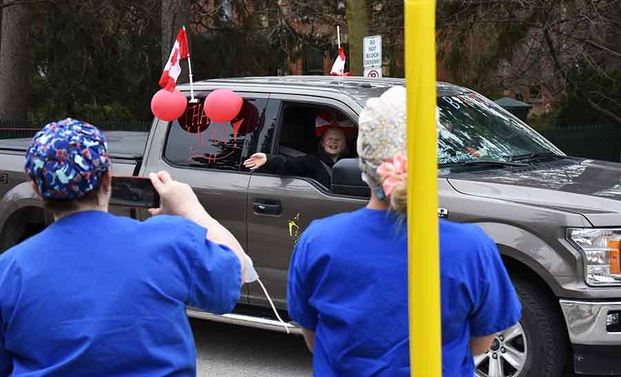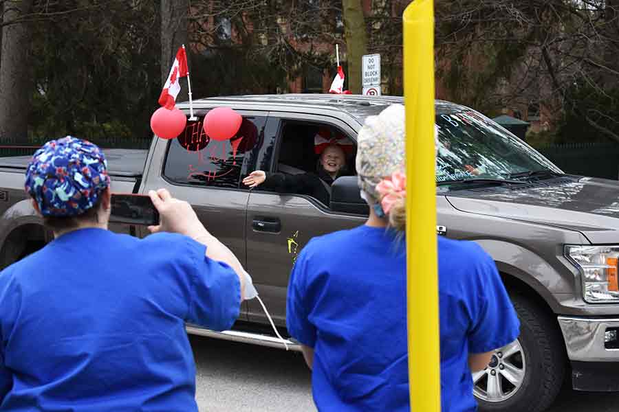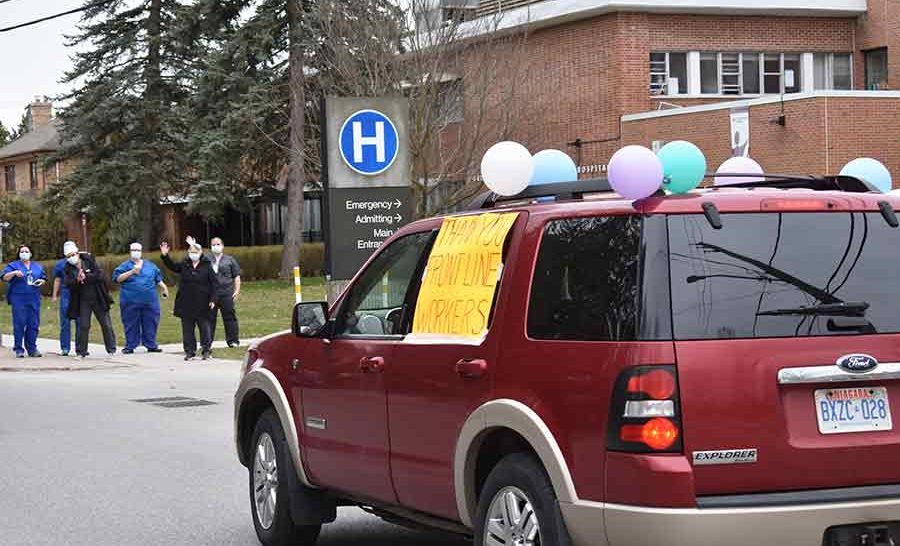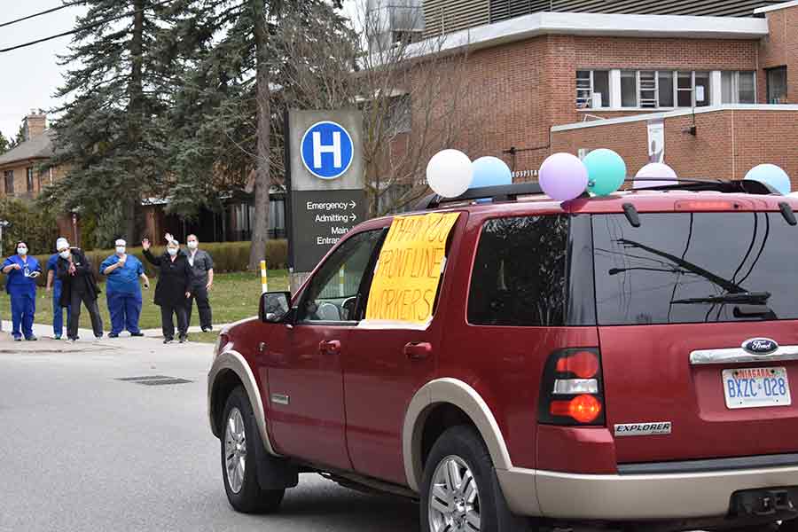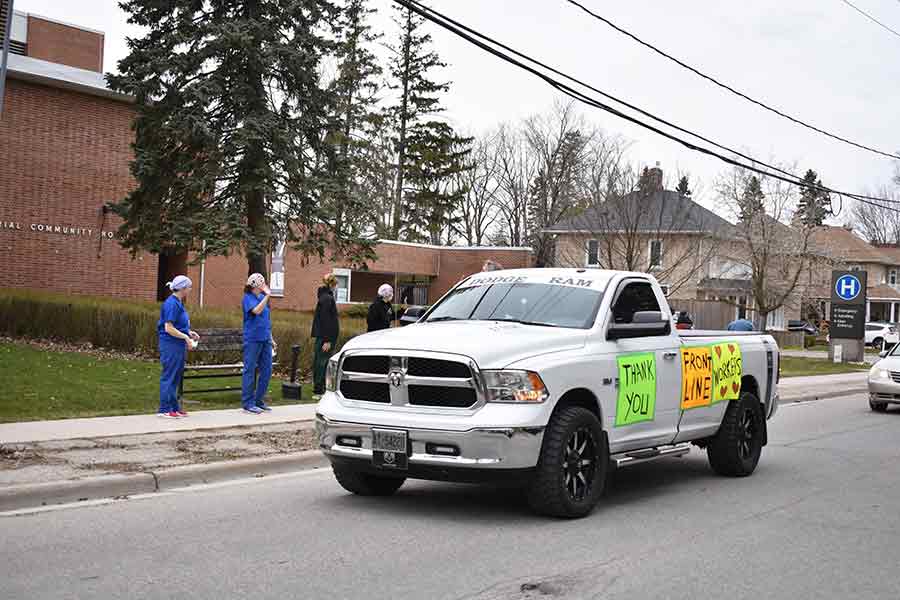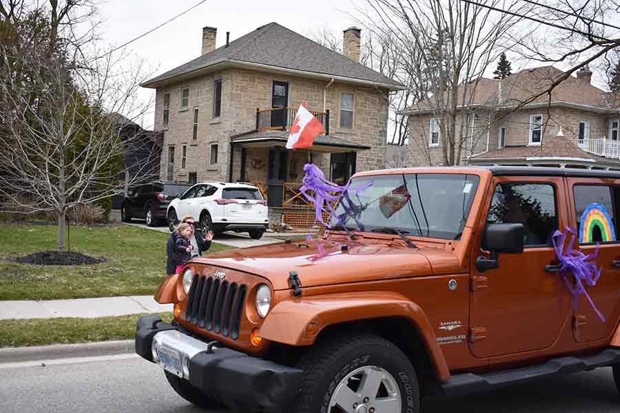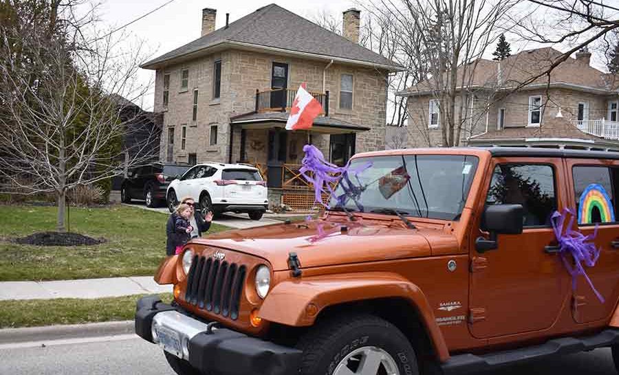Car rally – Frontline health care workers stood outside Groves hospital on April 26 as about 100 vehicles passed by displaying messages of support and gratitude. The car rally wove its way through Centre Wellington, acknowledging workers at various stops, including Caressant Care Fergus, Highland Manor, Guelph-Wellington Emergency Services, the Wellington County OPP, Wellington Terrace in Aboyne and the Elora fire station.