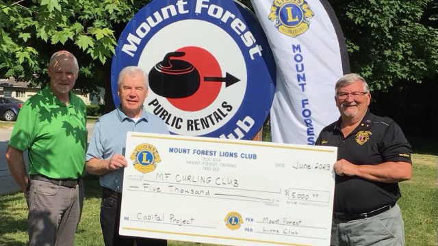 MOUNT FOREST – Mount Forest Lions Club President George Laurencic, right, presented the Mount Forest Curling Club with a donation of $5,000 towards its capital project.