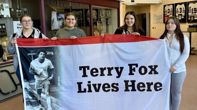 PALMERSTON– Norwell District High School students hold up a flag on Terry Fox Run day.