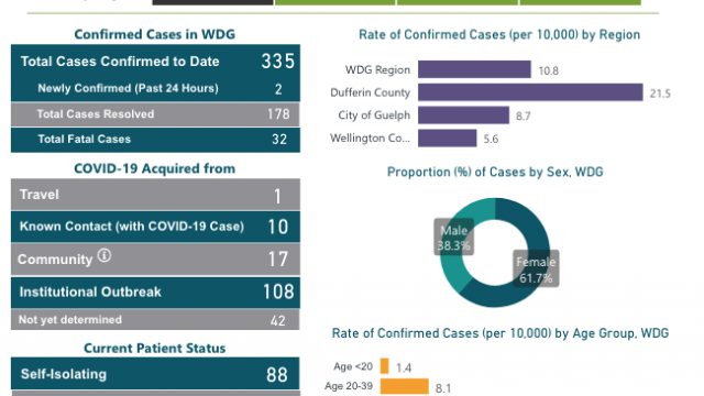 A May 15 update on the Wellington-Dufferin-Guelph Public Health (WDGPH) indicates there are 55 cases in the county, including 35 resolved cases and two deaths.