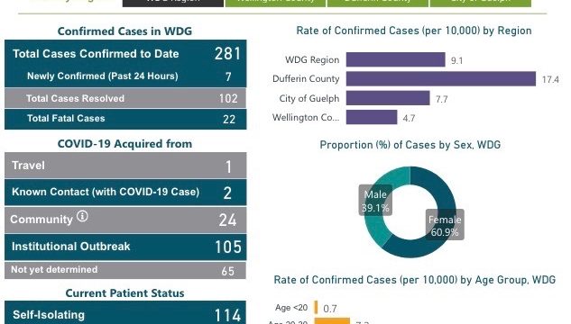 WELLINGTON COUNTY - Confirmed COVID-19 cases in the Wellington-Dufferin-Guelph Public Health (WDGPH) region have risen to 281.