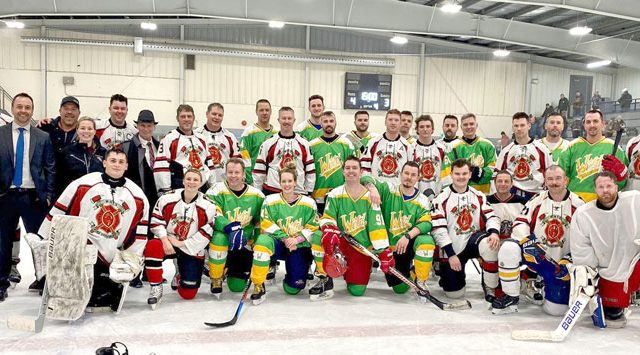 FERGUS – The Cyclones (red) battled it out with the Lacombes (white) on March 15 at the 2024 senior broomball provincial championships in Fergus.