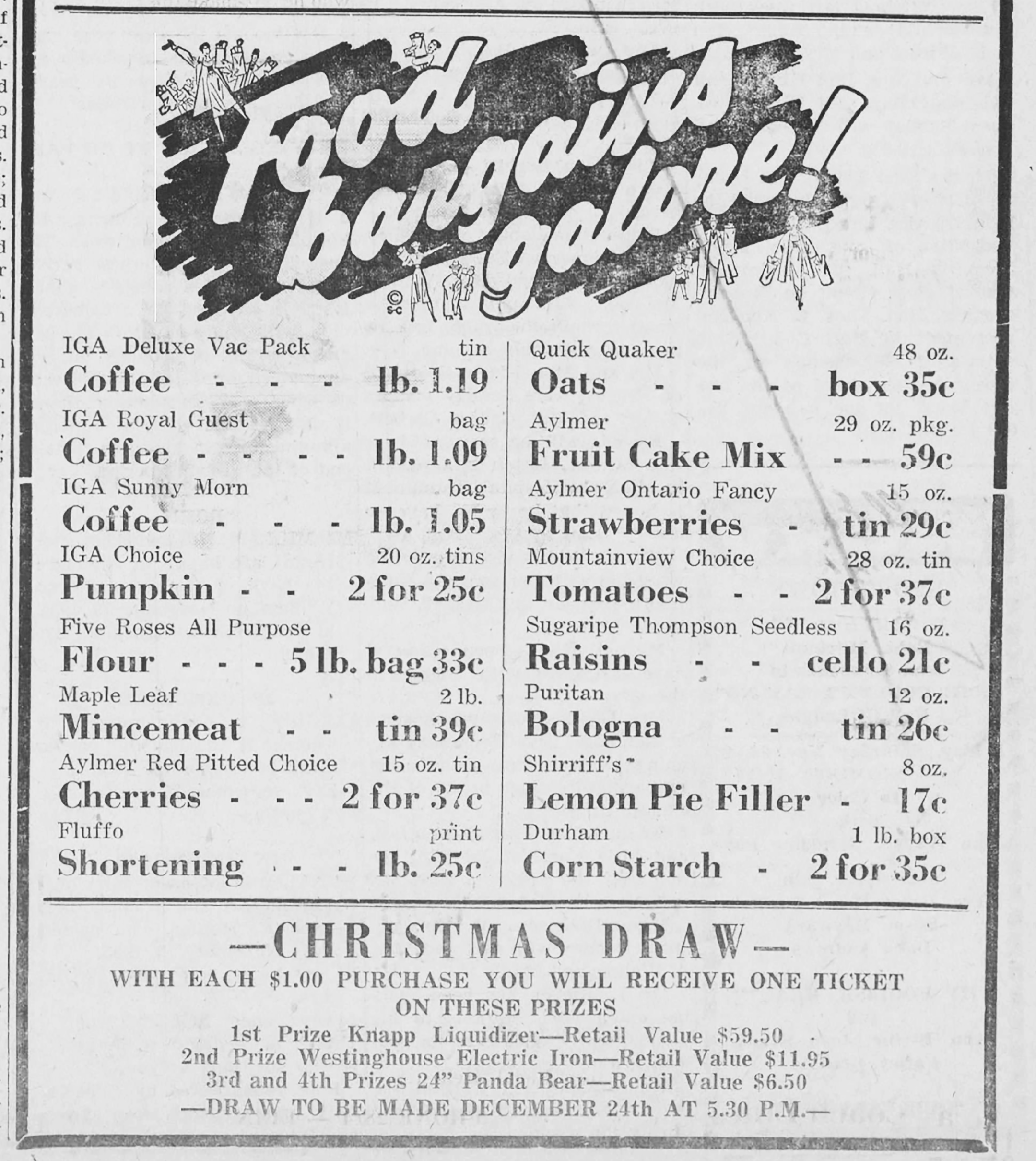 Not all the special events were for children. The Elora Players, forerunners of the Elora Community Theatre, staged a production of The Holy and the Ivy at the village’s armoury hall (now the Elora LCBO) on Dec. 13 and 14. On Dec. 17, the Arthur Legion held a Christmas dance, to music by Lang’s Orchestra of Kenilworth. About 200 couples showed up, many from a distance. A highlight was a midnight raffle of 20 turkeys.