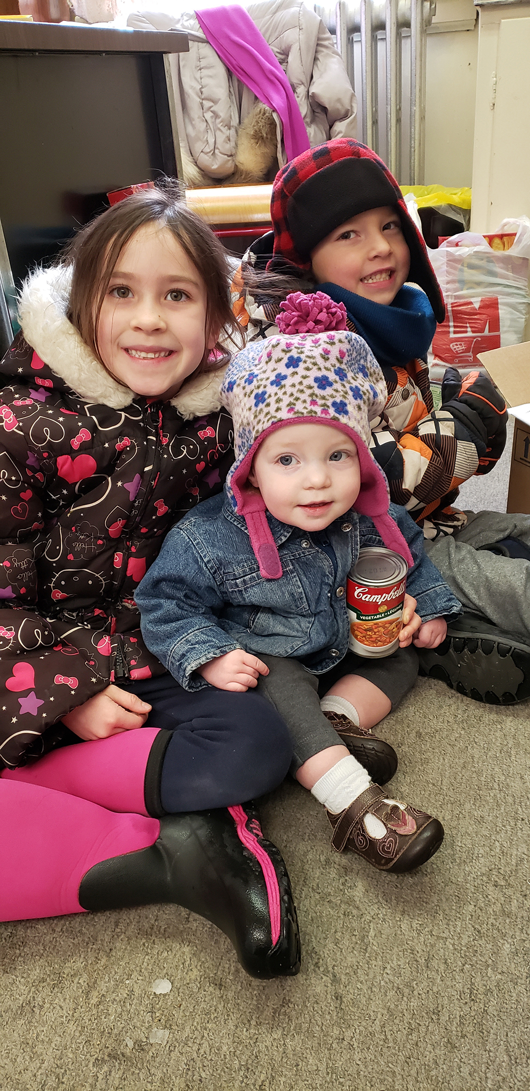 This trio shows off a small sampling of the three to four boxes of food collected at a recent birthday party for Olivia (7) and Jack Lennox’s (5) whose birthdays are just eight days apart. On Feb. 23 a skating party was held for the pair, at which collections or funds were donated. Jack and Olivia’s sister Victoria, centre, holds a can of soup destined for the food bank. The Arthur food bank expressed gratitude for the donations. Submitted photo