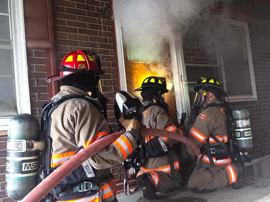 Under a garage overhang around the side of the house, a three-firefighter attack crew methodically breaches a door, funnelling a 1.75-inch hose through the doorway to drown the fire at its source and find any trapped occupants.