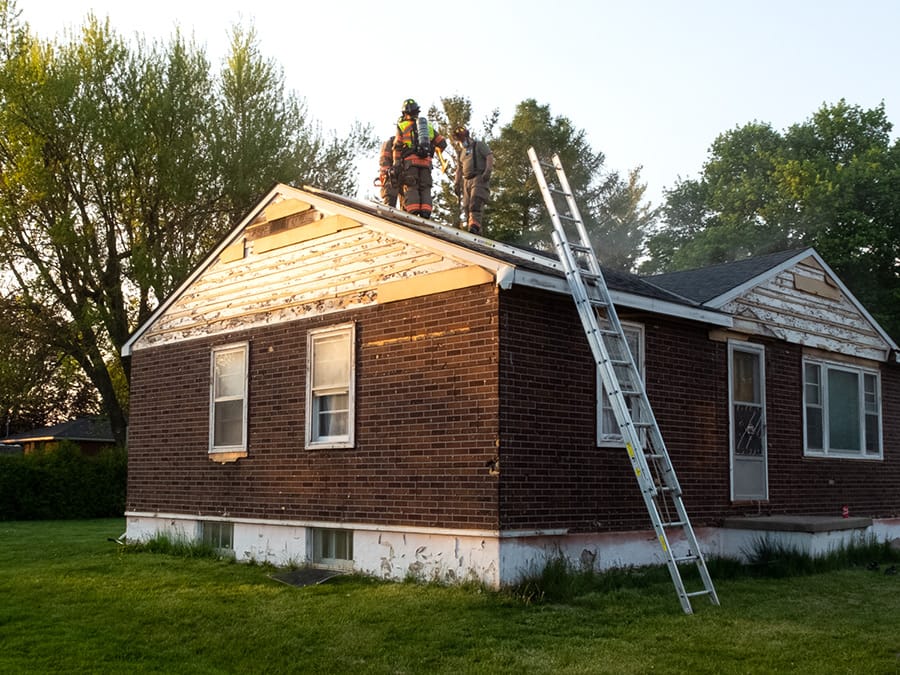 Centre Wellington Fire and Rescue volunteer firefighters are on the house’s roof — shingle and wood debris spit from the teeth of a whirling chainsaw as firefighters gnaw through, creating what’s known as a “vertical vent” to free the buildup of hot gasses below.