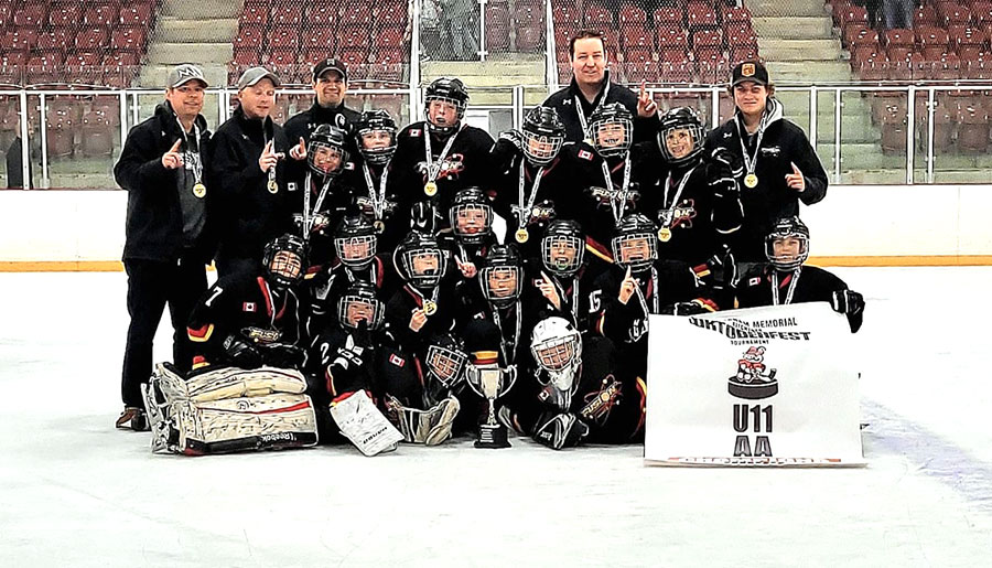 Claiming Gold – On Oct. 21 the Centre Wellington Fusion U11A team travelled to Kitchener to compete in the Kitchener Oktoberfest AA tournament. Team officials say the players worked hard and battled together, going undefeated and winning the gold medal in a 3-0 game against the Barrie Colts. Bottom row (goalies) from left are: Conner Beirnes and Ronan Willoughby. Middle row, from left: Colson Sullivan, Sydney Heasman, Chase MacDonald, Drew Ferguson, Max Downey, Tayler Halls, Cade Martin, Mitchell Readyhough and Emerson Fox. Top row from left: Caine Machin, Evan Ososki, Ashton Sullivan, Braeden McFarlane, Jack Stracina and Spencer Mackay. Coaches, from left: Jeremy Machin, Chris Ososki, Scott Heasman, Craig Downey and Brock Hoelscher.