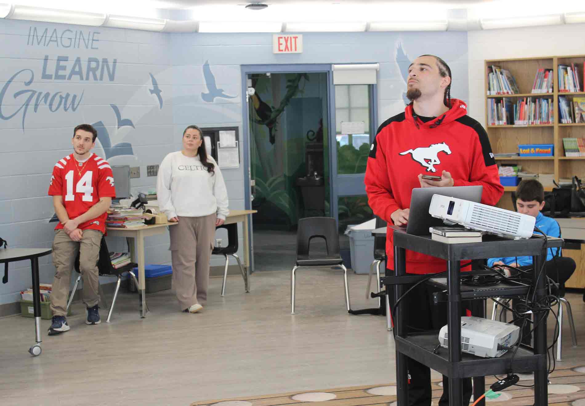 Grade 7 teacher Brady Ricci stood near the front of the room wearing a number 14 Stampeders jersey with Barnes’ name across the back as well as his signature.
