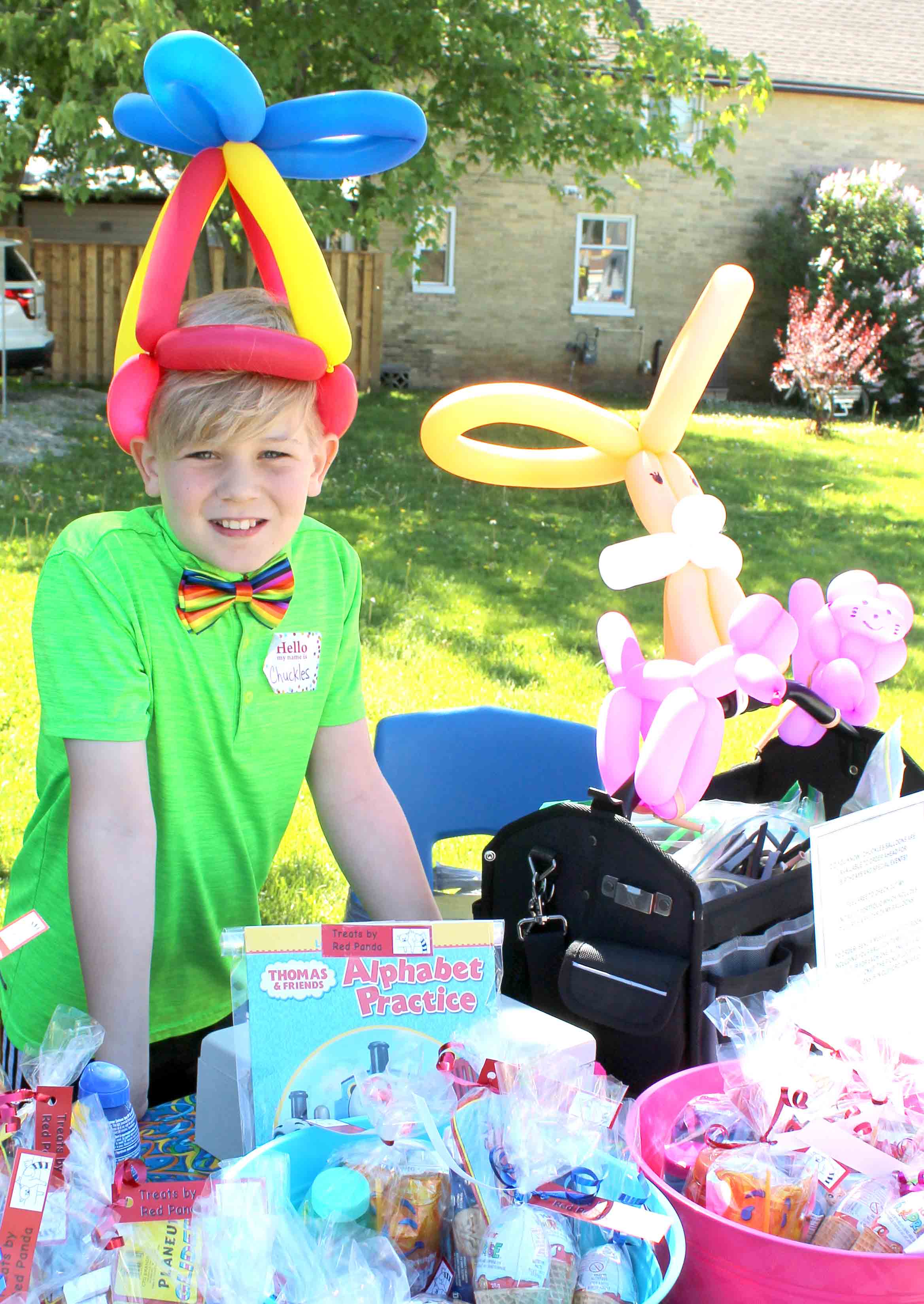Ten-year-old Garrett Schouten set out a table of his Chuckles balloon creations and fun gifts for sale.