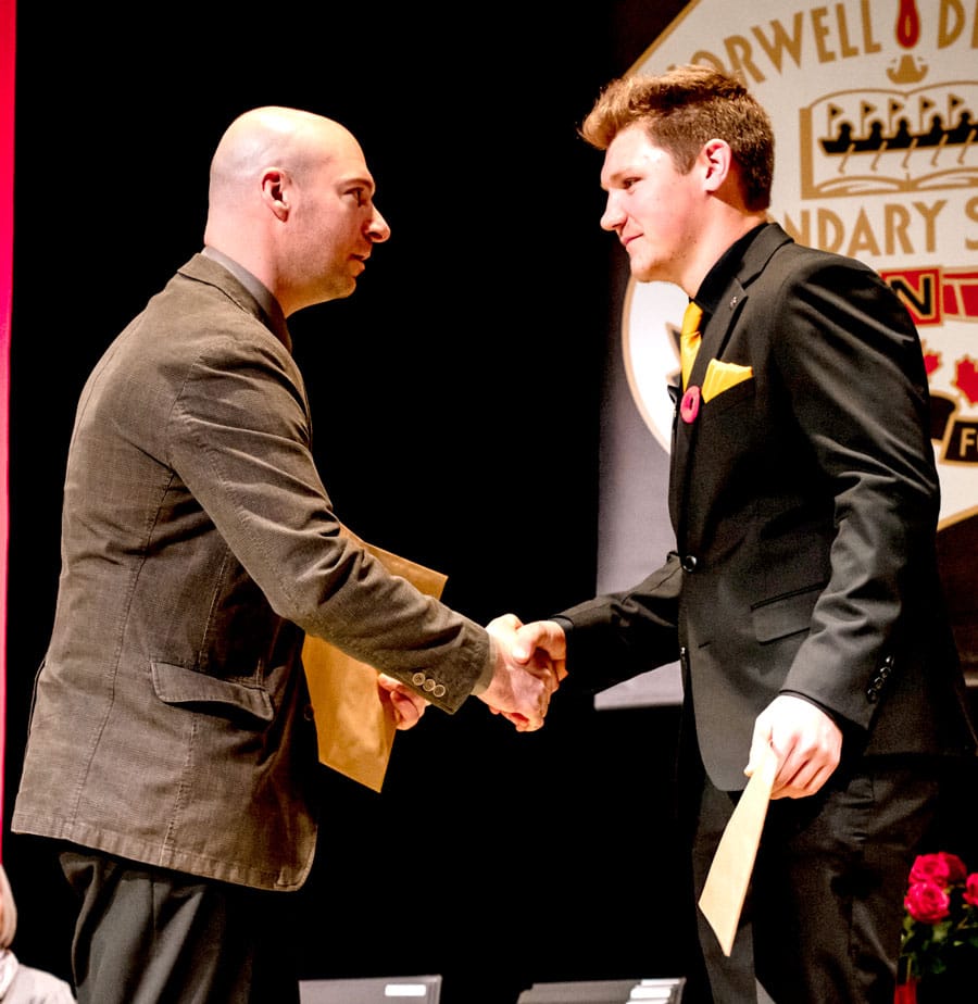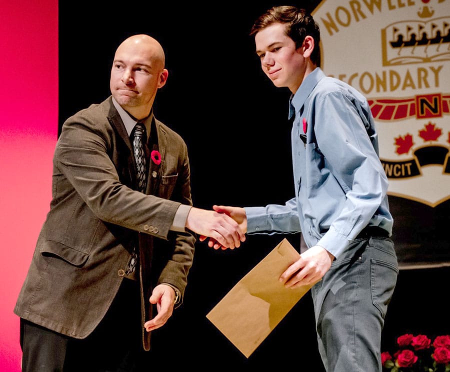 Duncan Wanless delivered the valedictory address at the Norwell District Secondary School commencement on Nov. 3.Kate Howlett, right, received the Minto Youth Action Council Bursary, which was presented by Erin Raftis. This is given to a student who has a passion for the Minto community, exemplary community involvement and volunteerism, and attending a post-secondary program. Howlett also received the Dean Jackson Memorial Agricultural Bursary, which was established in memory of Dean by his family. The award goes to a student attending a post-secondary program related to agriculture. That award was presented by Brittni Jackson.During commencement ceremonies at Norwell District Secondary School on Nov. 9, teacher Tyson Smith presented an Ontario Youth Apprenticeship Program Student Recognition Award to Wesley Schieck, who was one of two recipients for outstanding work in the co-op program and dedication to the trades.Smith also presented the T.G. Minto Skilled Trades Award, given to a student because of their excellent achievement in technology, dedication to co-op and pursuit of an apprenticeship in the trades, to Declan Todd.