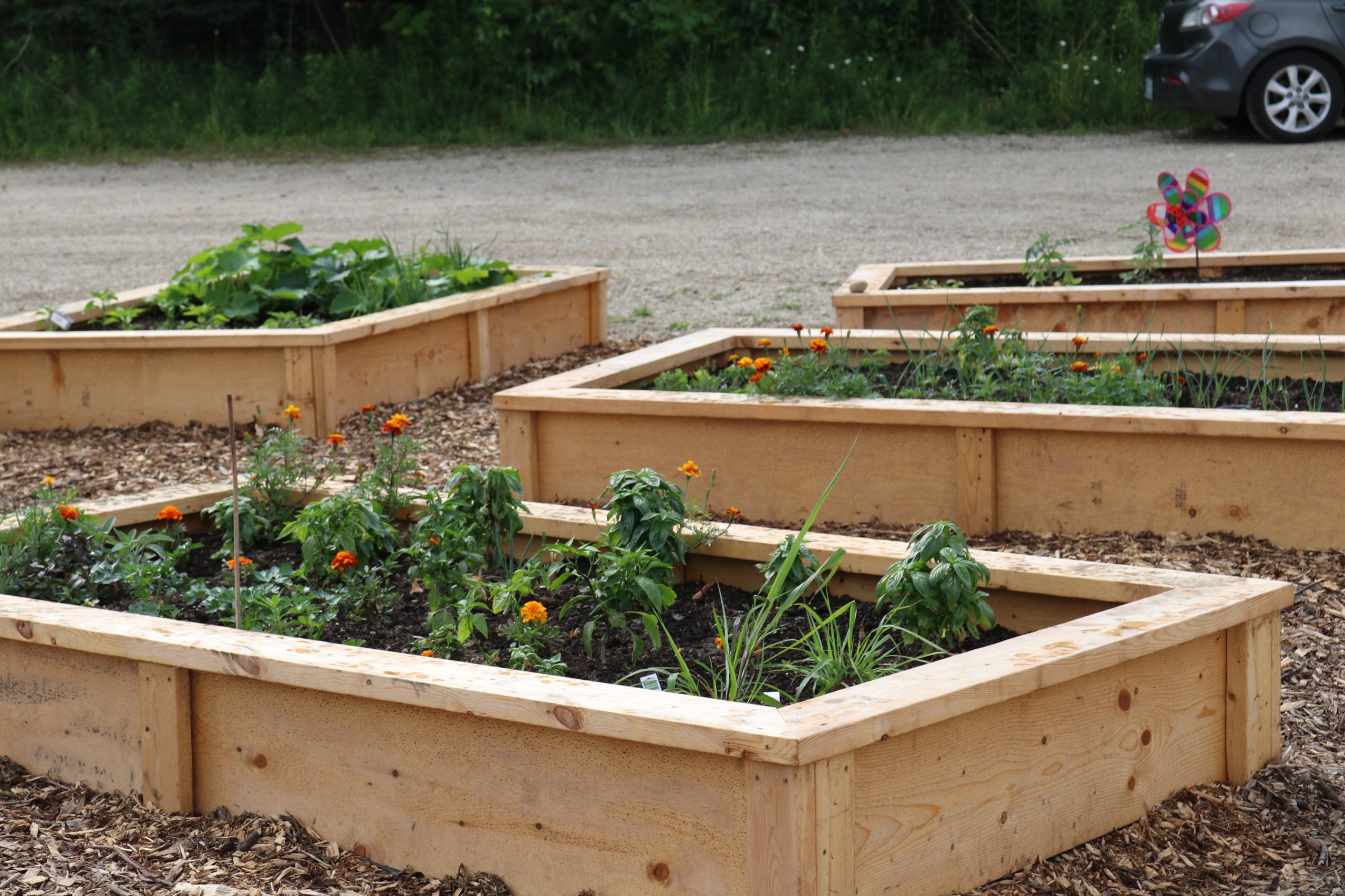 The garden has three large planters designated for the food bank.