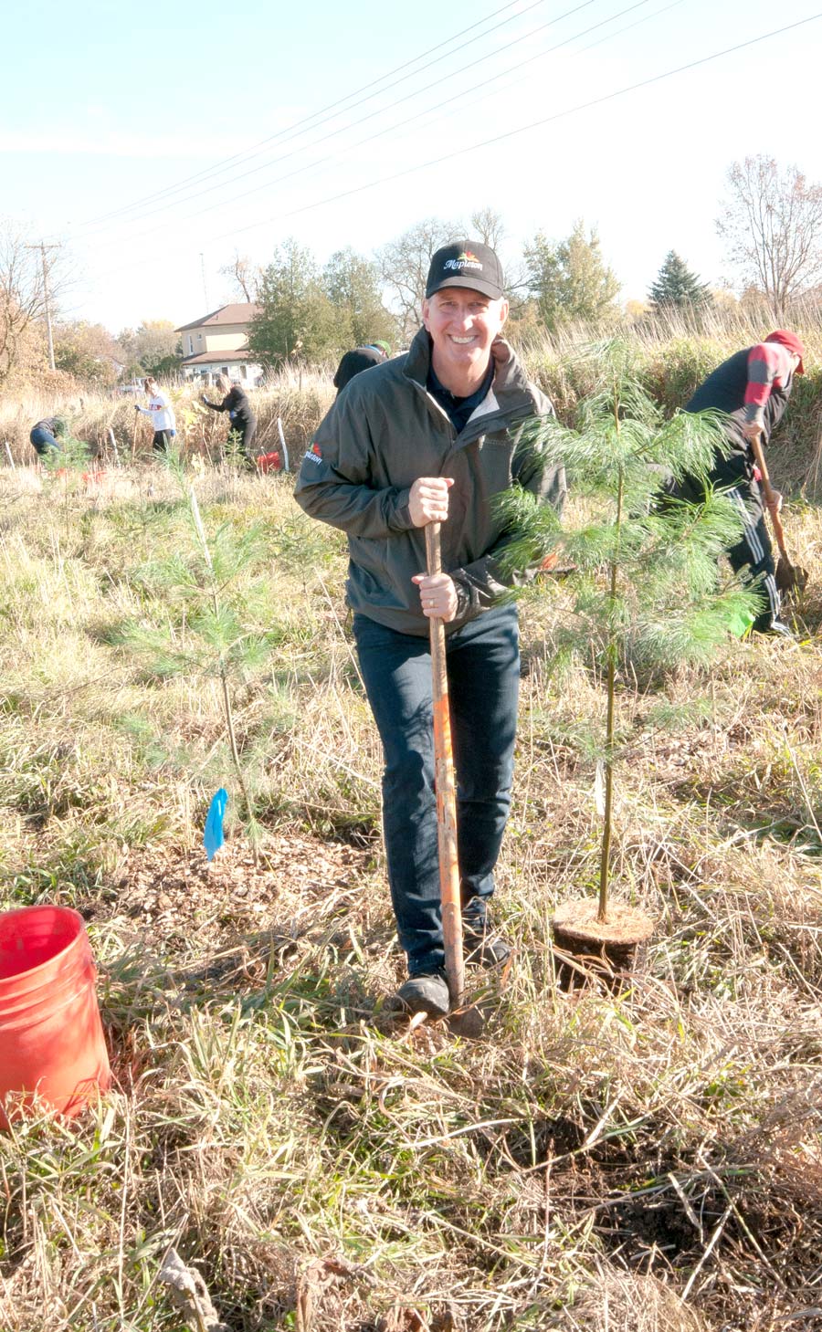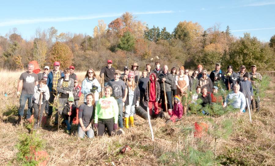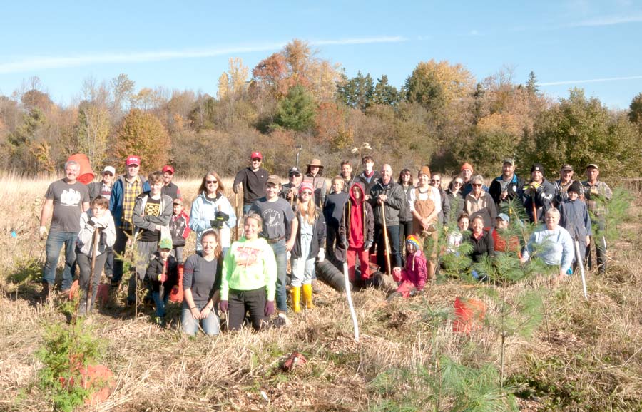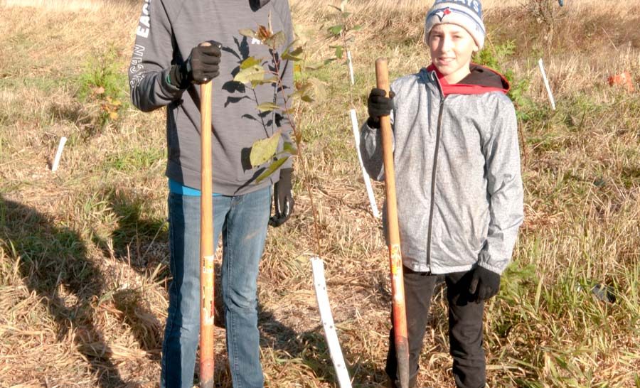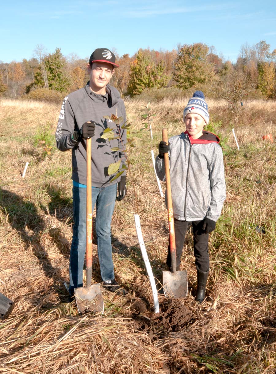 Community planting – Trees for Mapleton hosted a community tree planting at the Paul Day Legacy Forest in Riverside park in Drayton on Oct. 19. In just over an hour, 450 trees were planted bringing the total number of trees planted to date to around the 2,000 mark. The goal is to plant one tree for every resident of Mapleton, approximately 10,000 trees, over a five-year period. PHOTO ONE: Volunteers at the planting. PHOTO TWO: Volunteers Tyler Gerth, left, and Gavyn Lee. PHOTO THREE: Mapleton Mayor Gregg Davidson also pitched in. Photos by Jennifer Goertzen