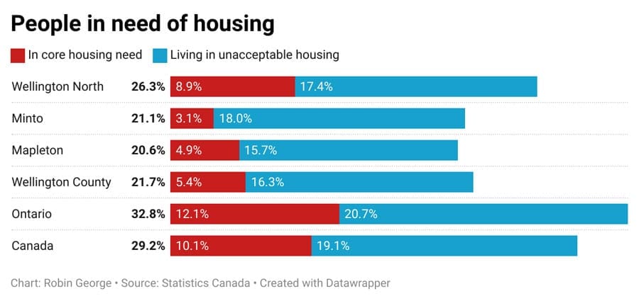 In Wellington County overall, 5.4% of people are in core housing need and another 16.3% live in unacceptable housing.