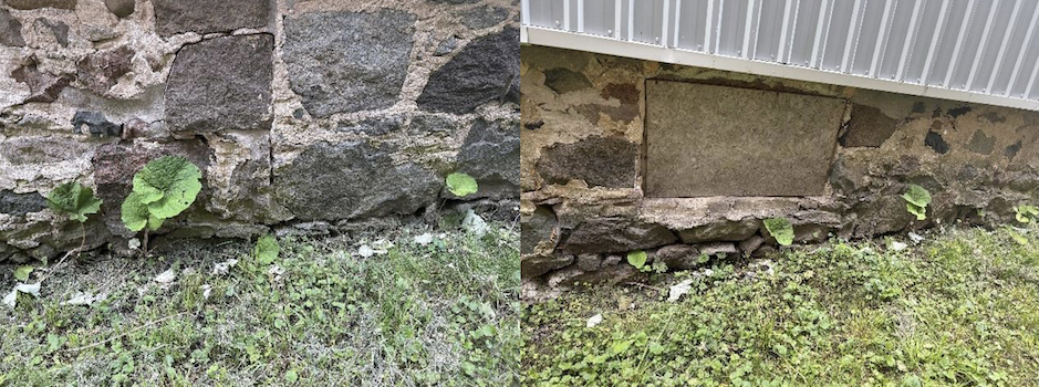 The latest improvement involves repairing the stone foundation, which will include chipping out old disintegrating mortar from the wall, cleaning mortar joints of loose debris, adding new mortar and cleaning the area.