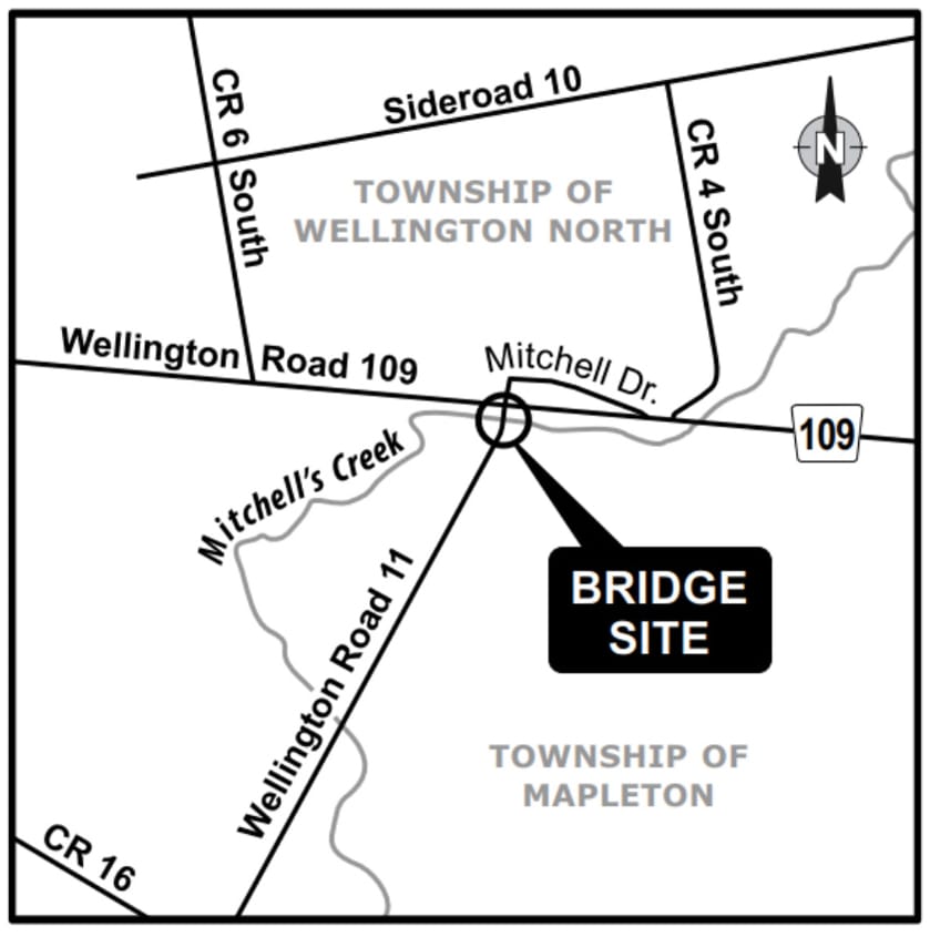 The bridge is located on Wellington Road 11, just south of the Wellington Road 109 intersection, at the border of Mapleton and Wellington North. The study area extends approximately one kilometre on either side of the bridge.