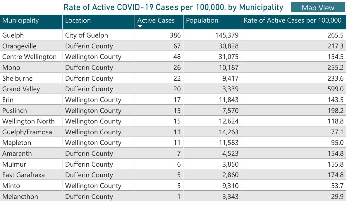 Guelph had 116 new cases over the weekend and now has 386 active cases, down from 399 last week.