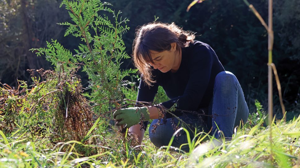 He had spent the previous day strategically placing the young potted trees throughout the site in spots they should be planted.