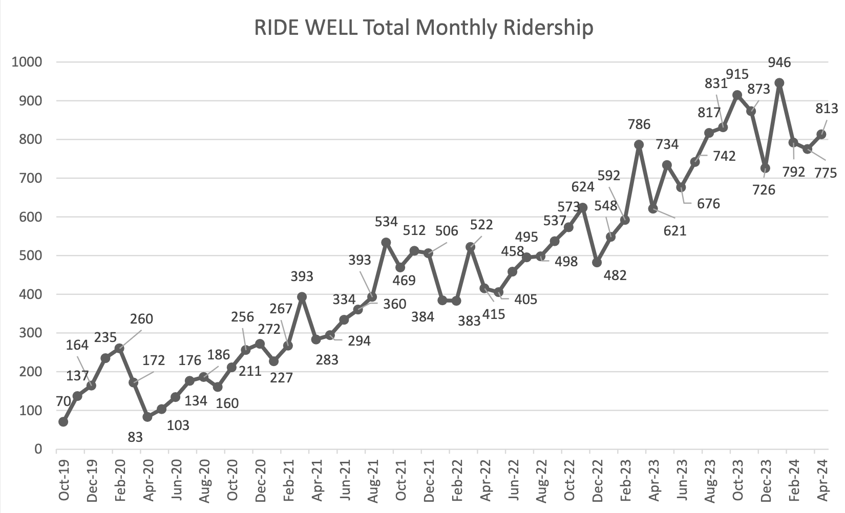 Despite a drop in ridership during the pandemic, use rebounded in more recent years, nearing a peak of 950 rides in January this year.