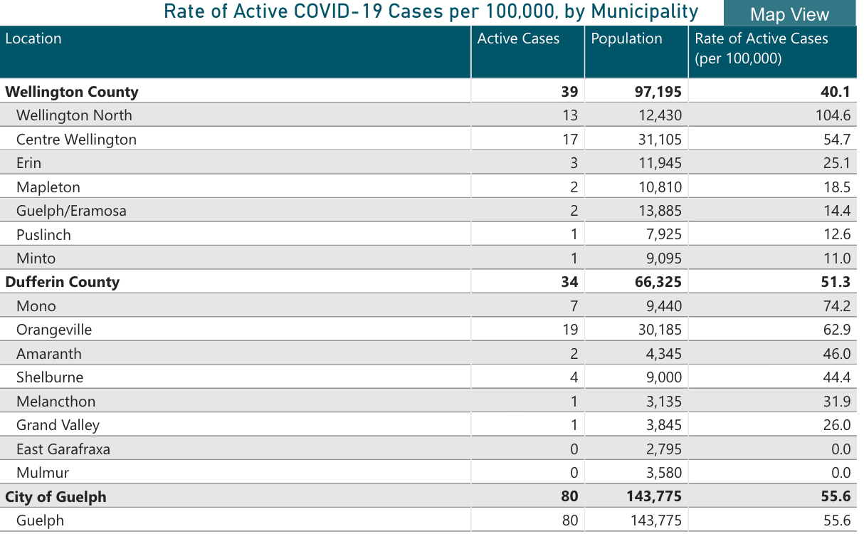 In Dufferin County there are 34 active cases (basically unchanged from 35 on Sept. 7) and in Guelph there are 80 (down from 98).