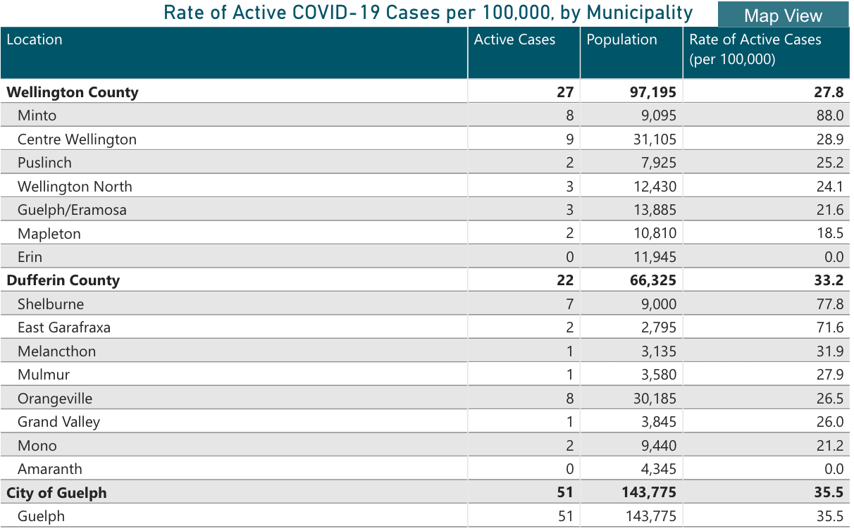 In Dufferin County there are 22 active cases (up from 19) and in Guelph there are 51 (down from 73).