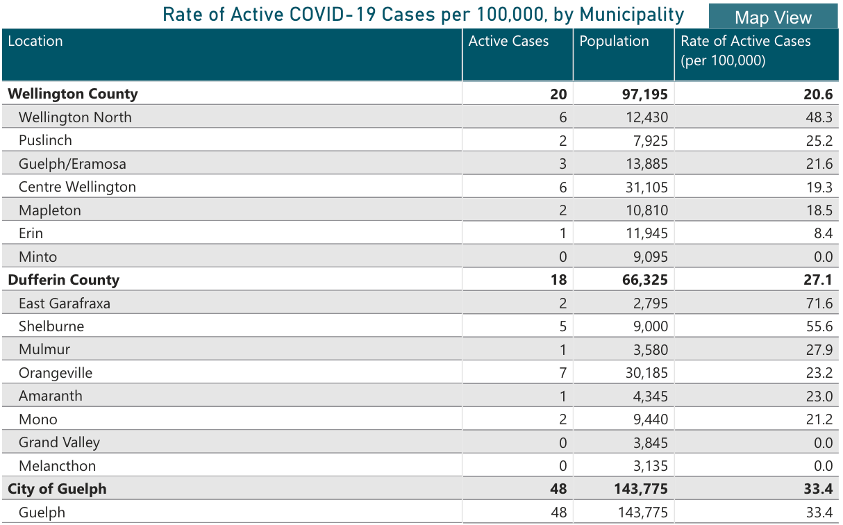 As of June 15, there are 20 known active cases in Wellington County (up from 14 on June 8), 18 in Dufferin County (up from 17), and 48 in Guelph (down from 63).