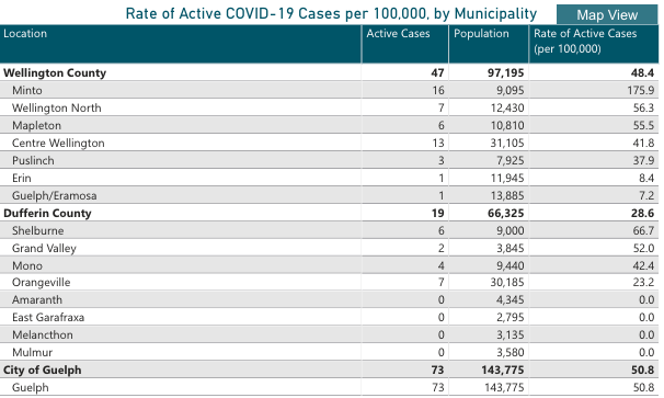 In Dufferin County there are 19 active cases (down from 32) and in Guelph there are 73 (down from 109).