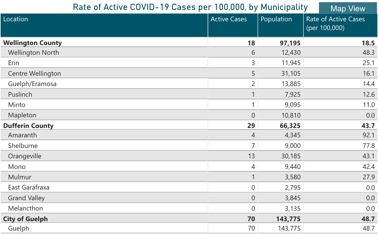 There are 18 known active cases in Wellington County as of June 29, (unchanged since June 22), 29 in Dufferin County (up from 20), and 70 in Guelph (up from 54).