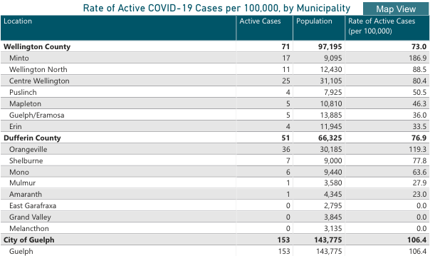 In Dufferin County there are 51 active cases (essentially unchanged from 50) and in Guelph there are 153 (up from 131).