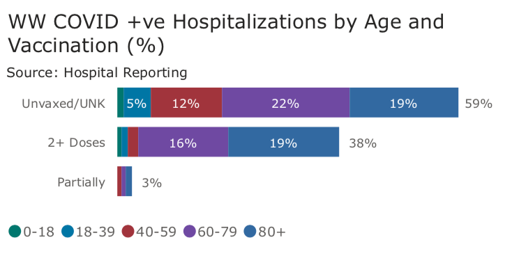 Vaccination statusThe Waterloo Wellington report notes about 59% of those hospitalized with COVID-19 are unvaccinated or their vaccination status is unknown, while 38% have received two doses and 3% are partially vaccinated.