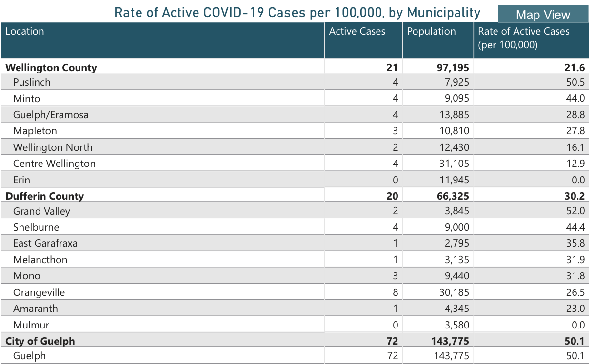 In Dufferin County there are 20 active cases (up from 14) and in Guelph there are 72 (down from 74 last week).