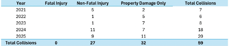 From June 2021 through December 2025 there were 52 collisions, of which 22 were non-fatalities, and 30 involved property damage only.