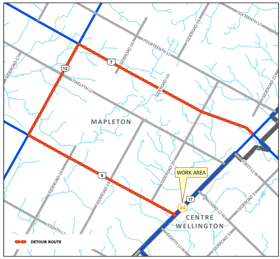 A notice from Wellington County’s roads division states Wellington Road 17 will be closed to through traffic at the bridge location from May 8 until Aug. 12.