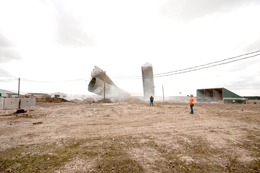 The silos, each measuring 30 by 100 feet, were felled by explosives under the watch of Adam Ghent of The Crushing Aghent, a company located in Wellington North.