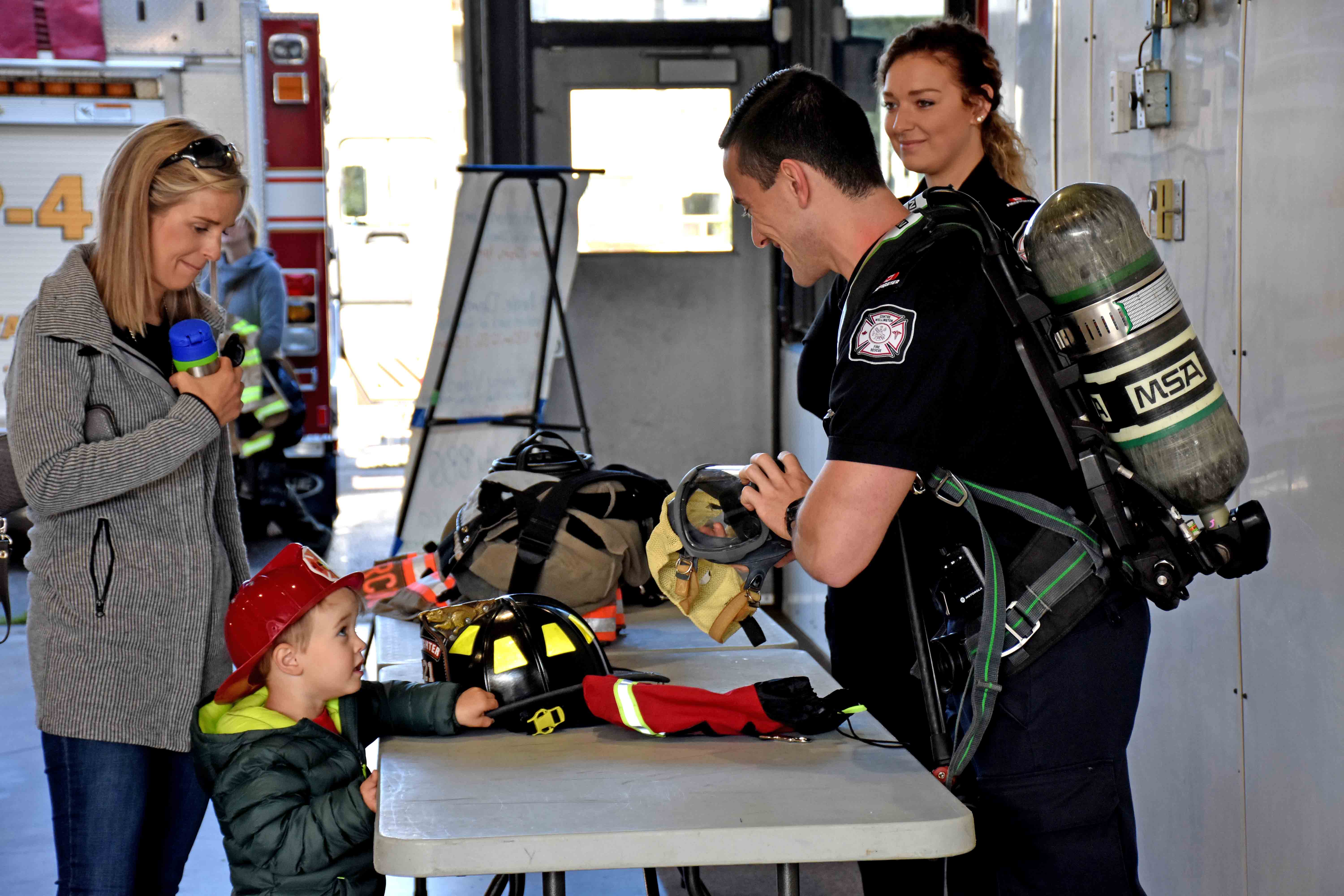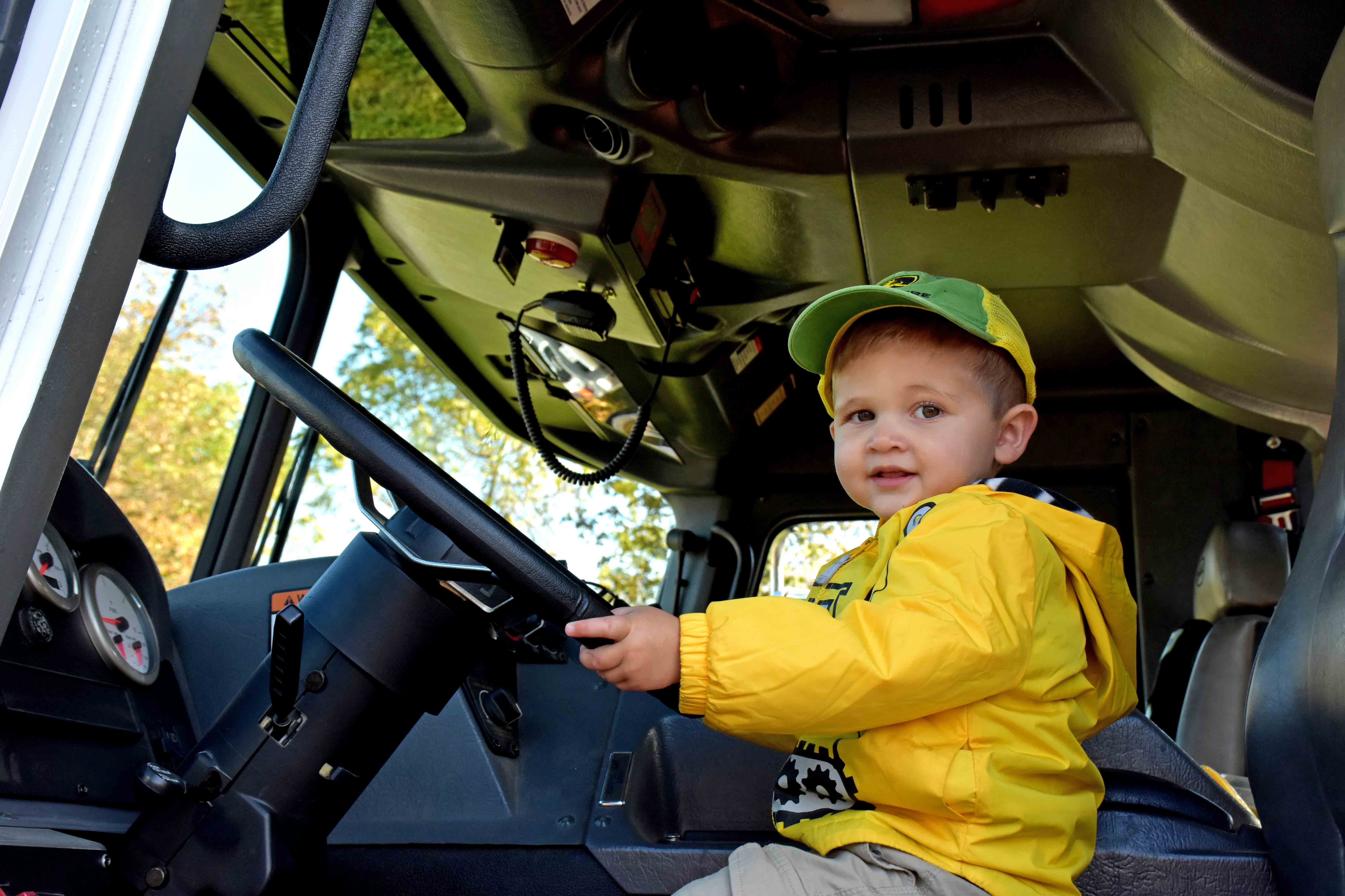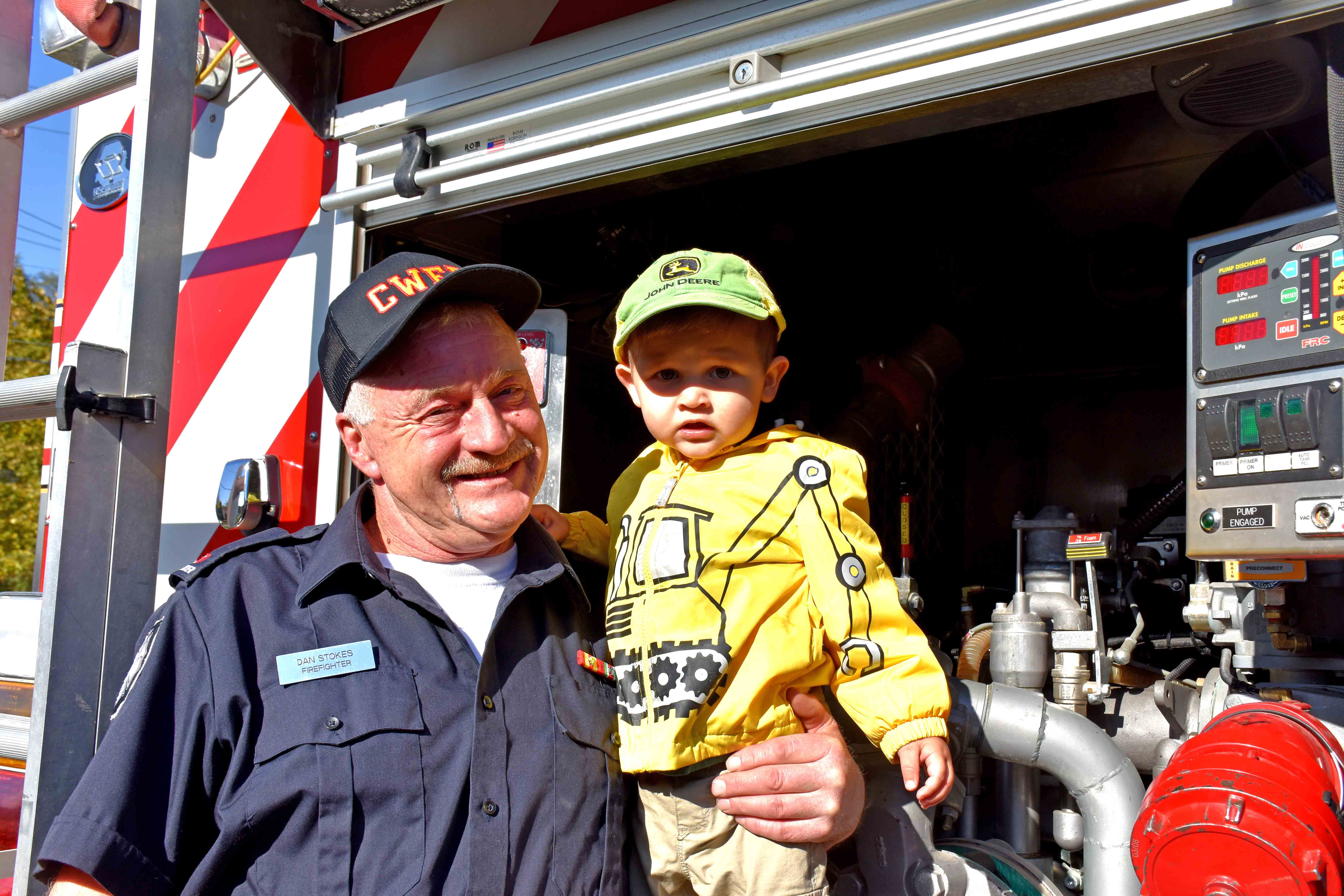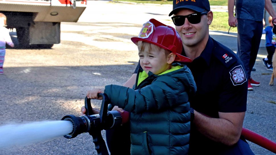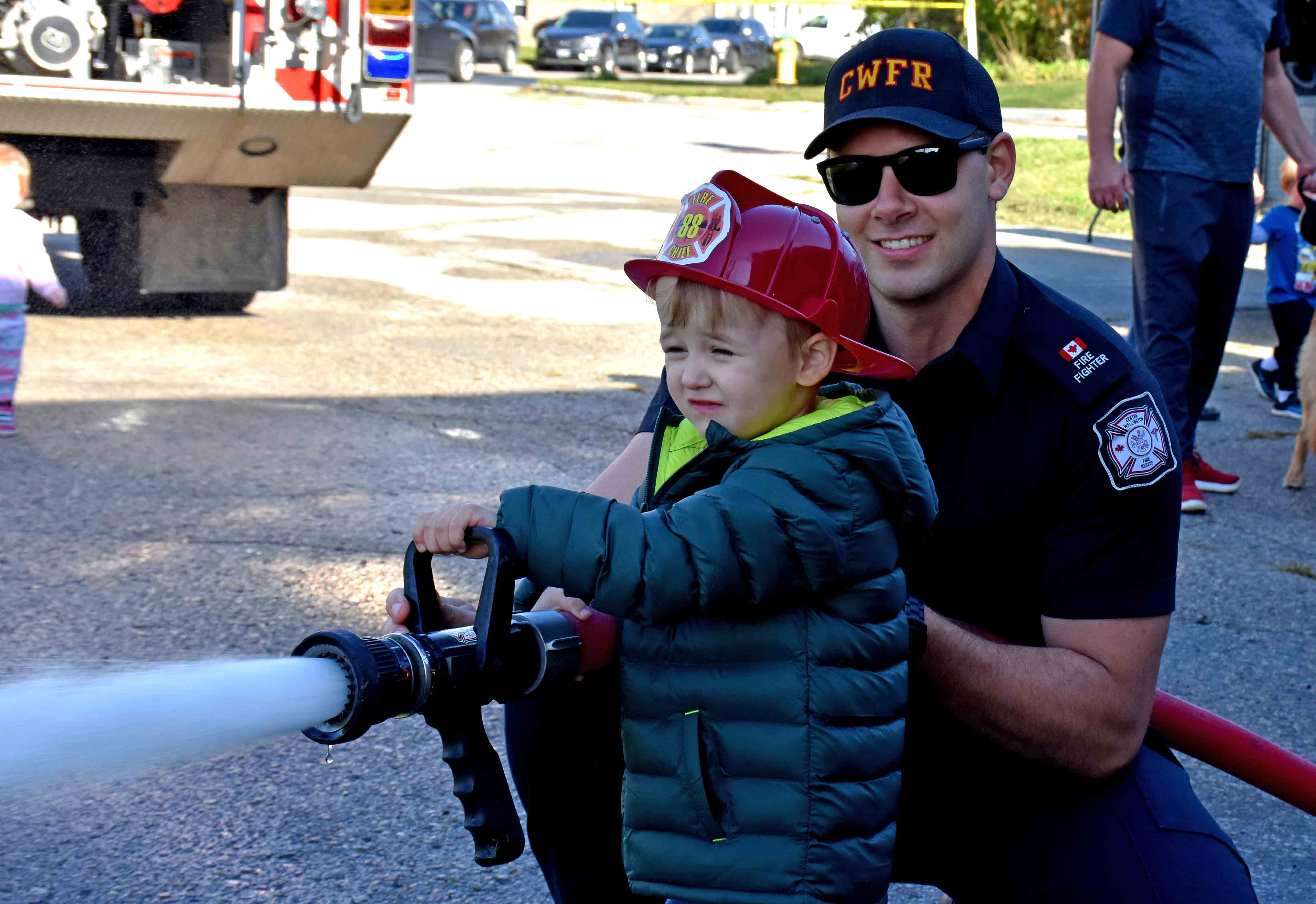Celebrating fire safety – The Centre Wellington Fire and Rescue open house at the Fergus fire hall on Oct. 20 was well attended by the young and the young at heart. PHOTO ONE: Tucker Goss is assisted by firefighter Michael Lahey; PHOTO TWO: Fergus firefighter Dan Stokes poses with grandson Jameson Stokes; PHOTO THREE: Jameson Stokes later takes the wheel of one of the fire trucks; PHOTO FOUR: Kate Parish demonstrates repelling techniques; PHOTO FIVE: parents and youngsters learn a bit about equipment used by emergency personnel; PHOTO SIX: and Andy Moore demonstrates more rappelling techniques. Photos by Mike Robinson