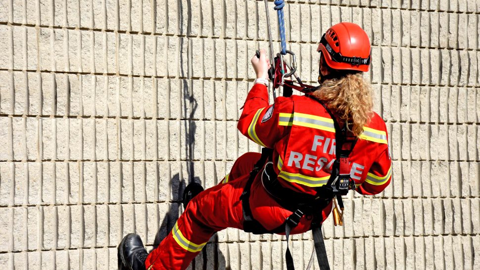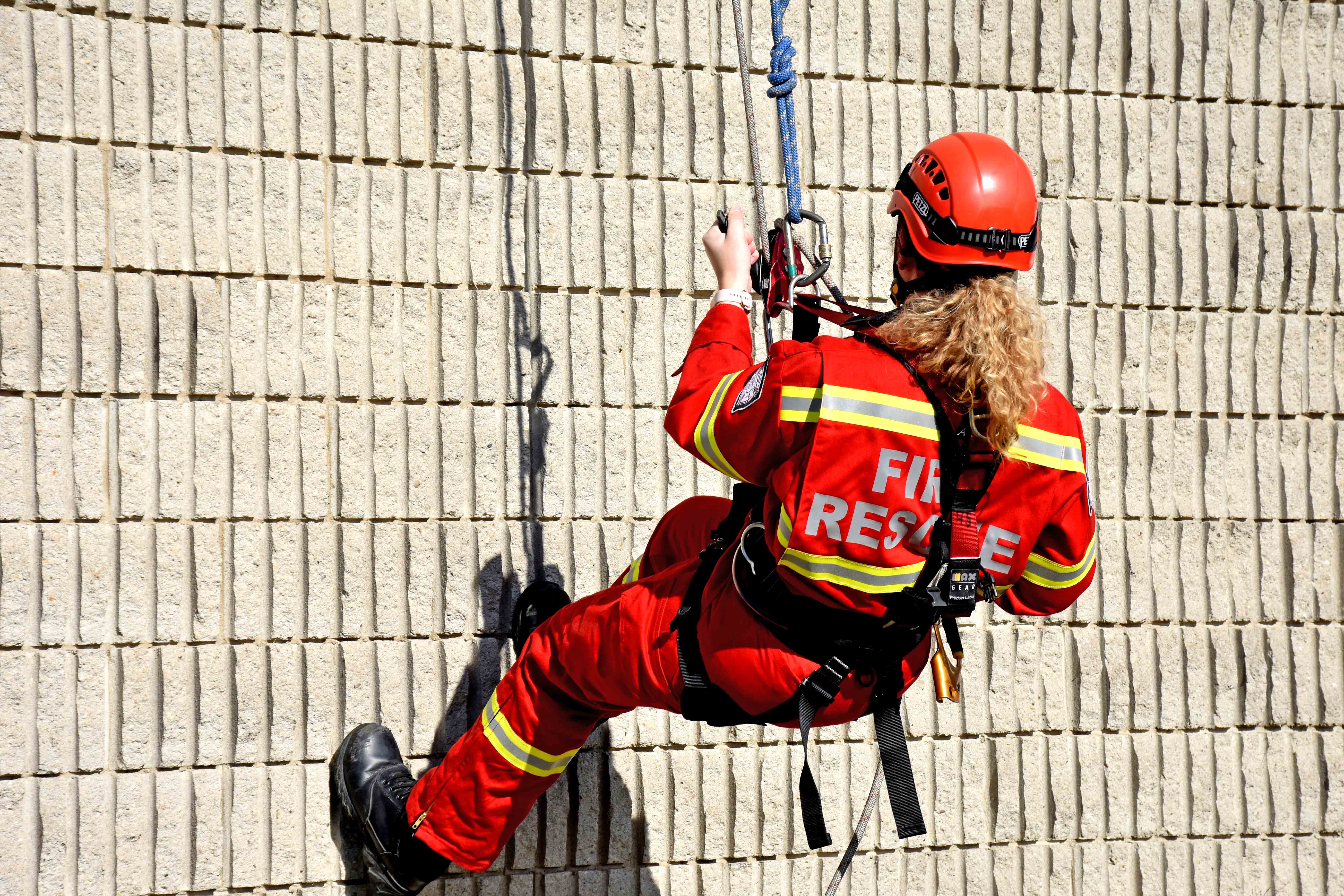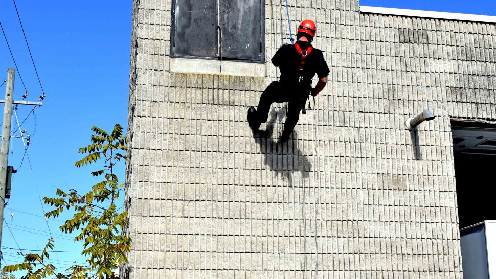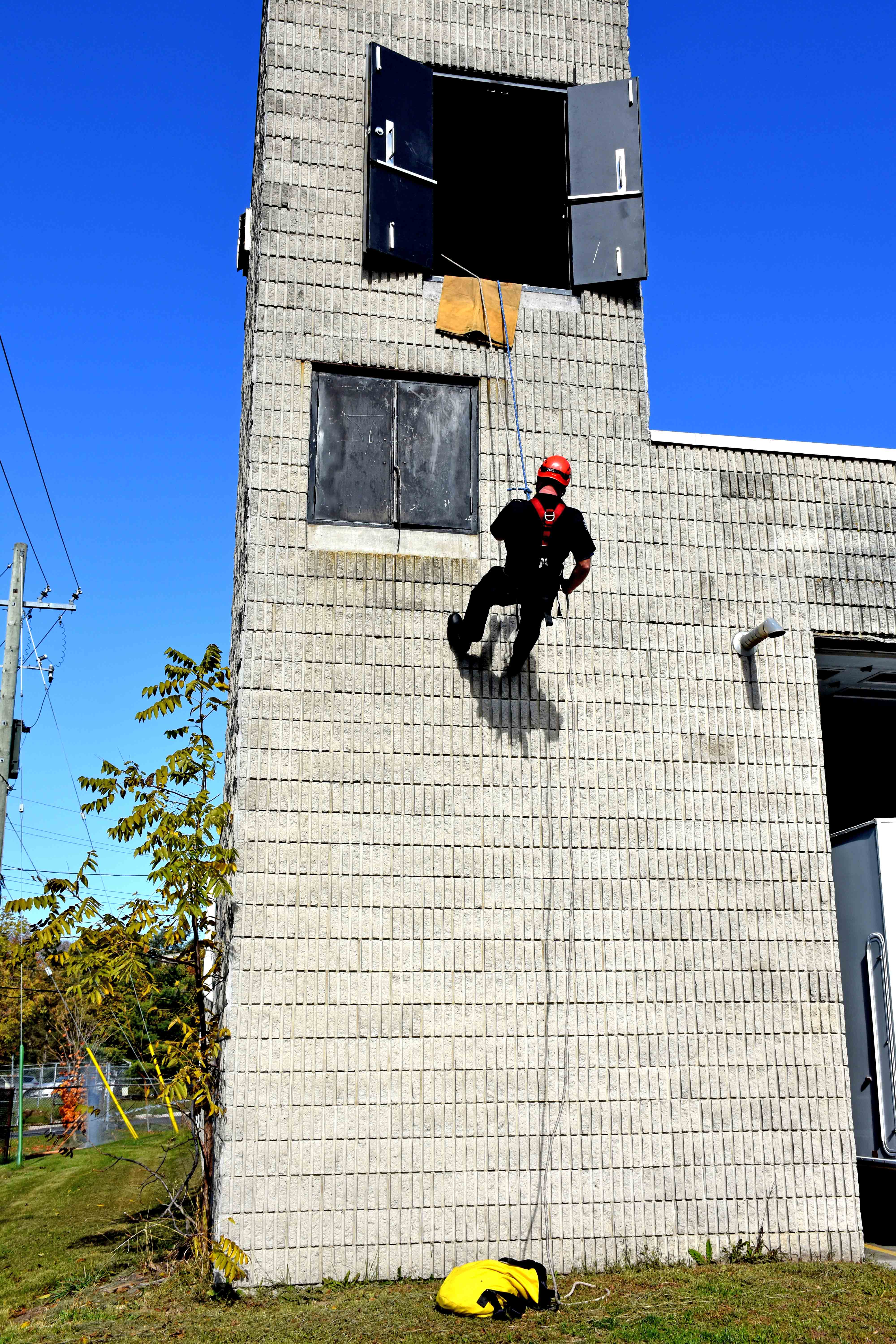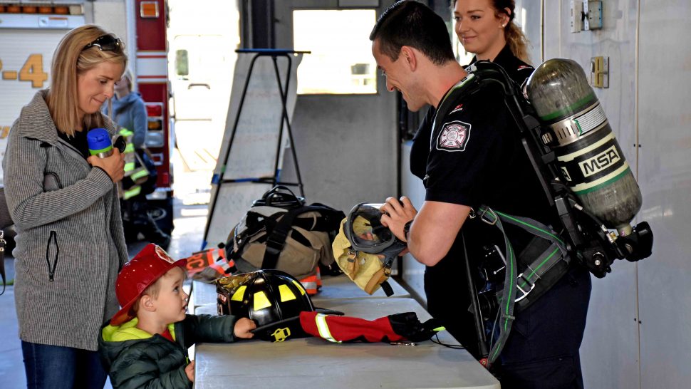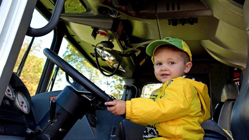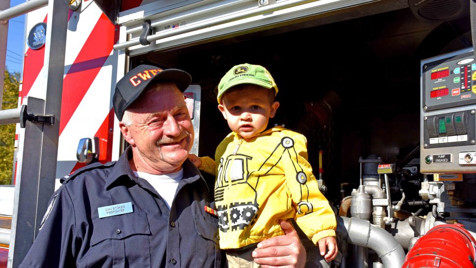 Celebrating fire safety – The Centre Wellington Fire and Rescue open house at the Fergus fire hall on Oct. 20 was well attended by the young and the young at heart. PHOTO ONE: Tucker Goss is assisted by firefighter Michael Lahey; PHOTO TWO: Fergus firefighter Dan Stokes poses with grandson Jameson Stokes; PHOTO THREE: Jameson Stokes later takes the wheel of one of the fire trucks; PHOTO FOUR: Kate Parish demonstrates repelling techniques; PHOTO FIVE: parents and youngsters learn a bit about equipment used by emergency personnel; PHOTO SIX: and Andy Moore demonstrates more rappelling techniques. Photos by Mike Robinson