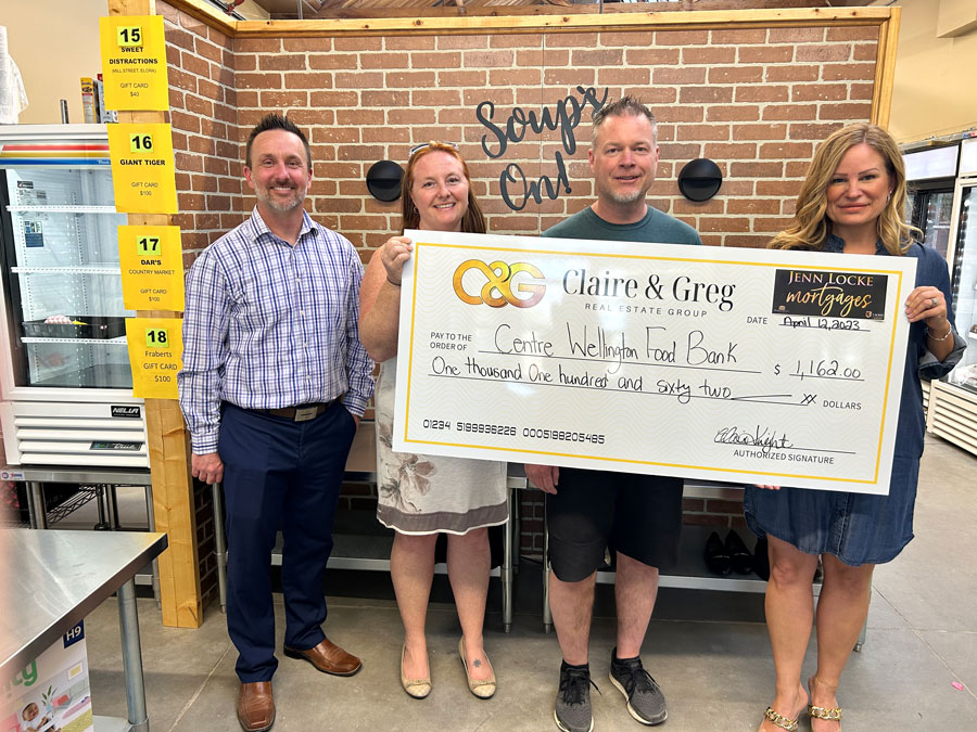 Donation – Claire and Greg Real Estate Group and Jenn Locke Mortgages, with the help of Centre Wellington businesses and the community, raised $1,162 plus multiple bags of food for the Centre Wellington Food Bank with the #CWGolden Egg Event again this year. Organizers thank all families and businesses who participated by searching for their gold egg at local businesses, visiting with the Easter Bunny at many of his locations and donating to the food bank. From left are: Greg Bernardi, Claire Knight, food bank executive director Curt McQueen and Jenn Locke.