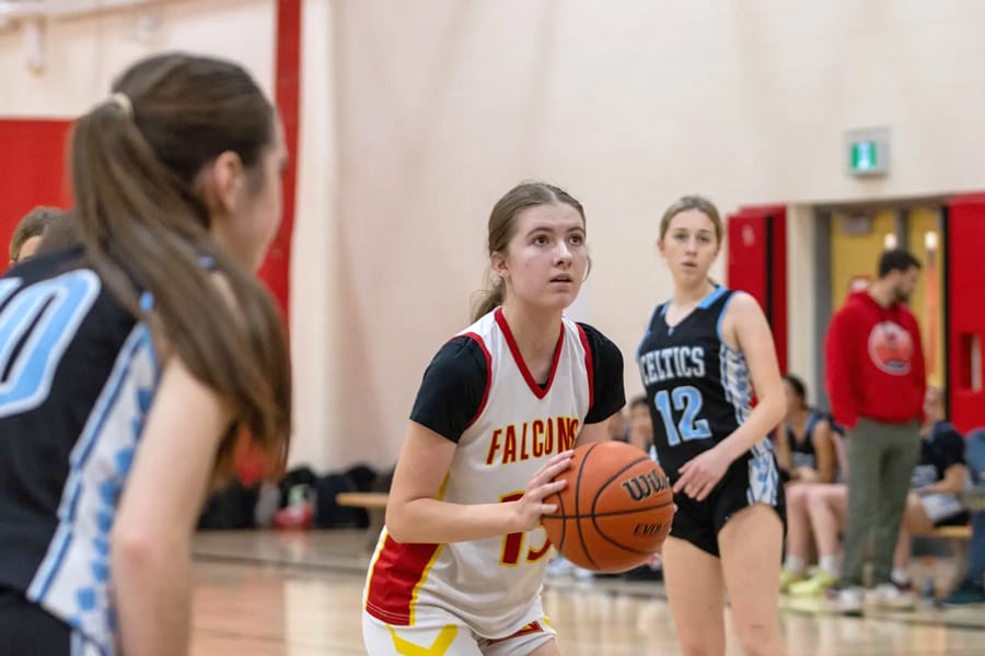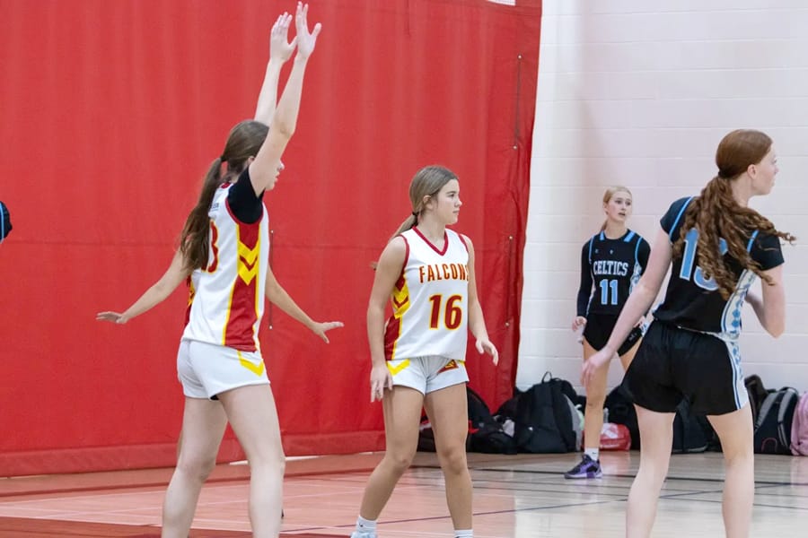 FERGUS – The Centre Wellington District High School girls basketball team played its last home game on Oct. 28, losing 42-30 to second place Bishop Macdonell Catholic High School. The team finished the season in seventh place and is in action this week in the playoffs. For longtime basketball players Emma Ling and Maggie Long it was their final home game as CWDHS falcons.