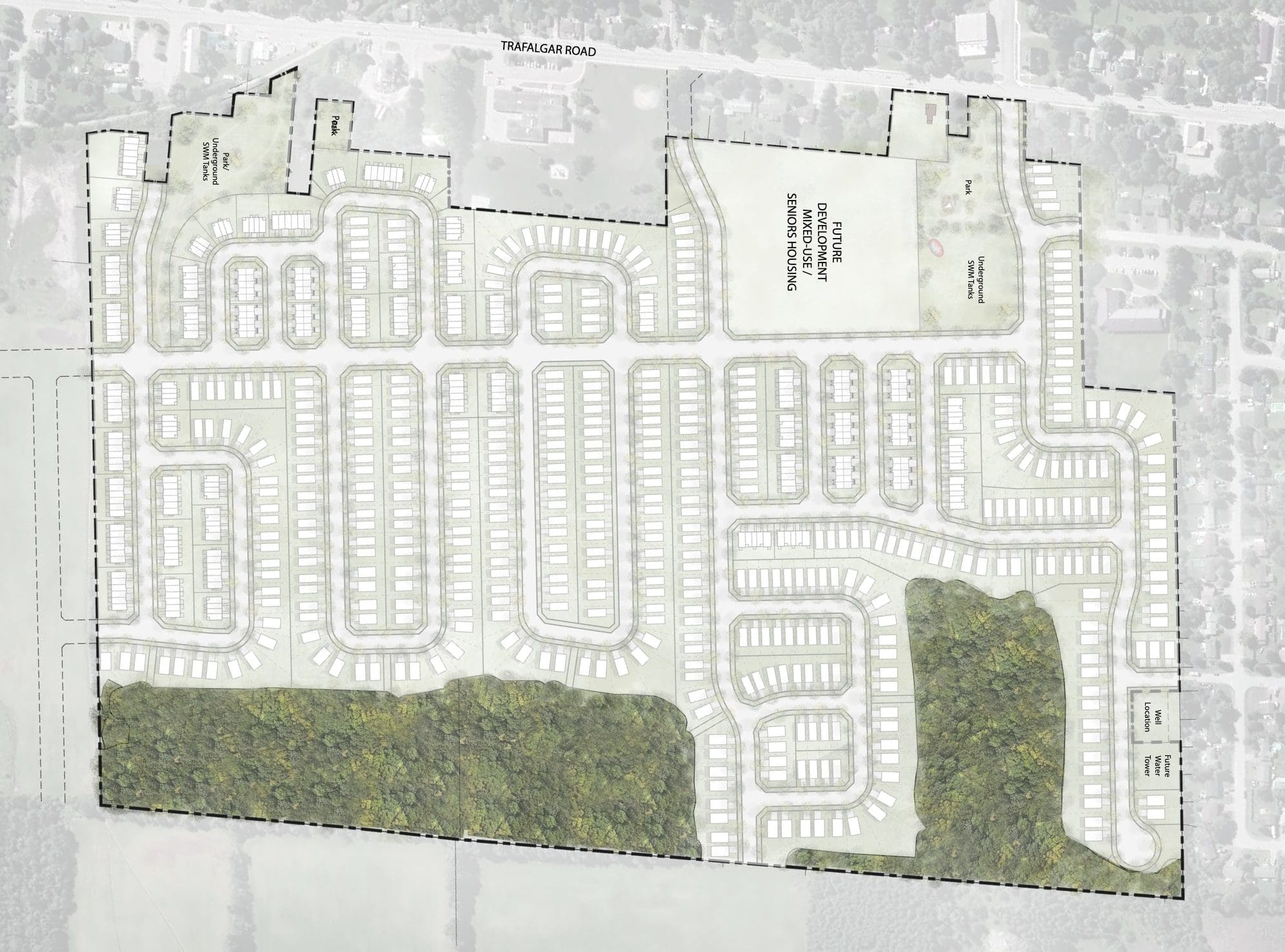 Early designs submitted by Beachcroft illustrate a mix of single-detached houses and townhomes, woodlots with trails, several park spaces, preservation of a 19th century home, and a 6.4-acre area focused on commercial space and senior-focused housing.