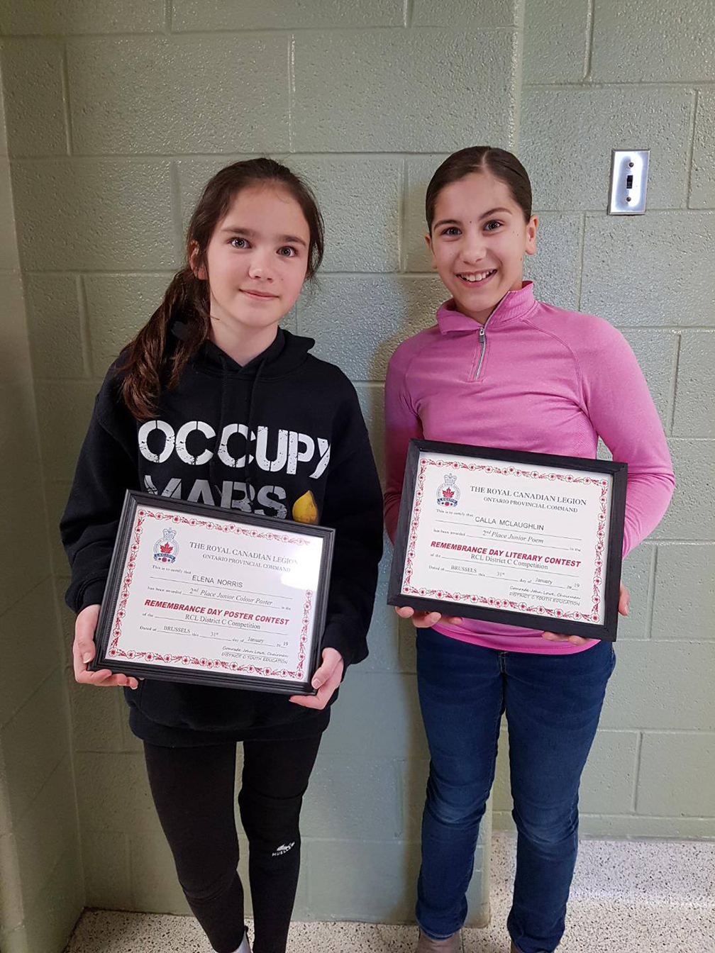 Harriston Legion Branch 296 is congratulating Elena Norris, left (junior colour poster), and Calla McLaughlin (junior poem)for finishing second in the 2018 District C Remembrance Day Poster and Literacy Contest. Submitted photo