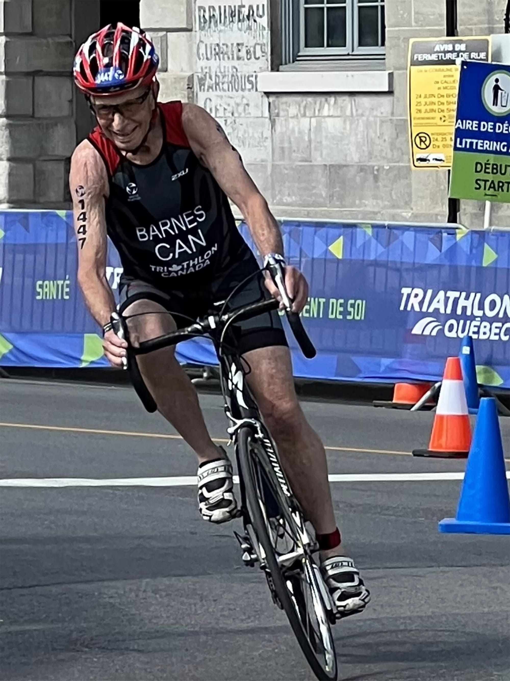In the summer of 2004, Barnes competed in his first Olympic-length triathlon at Guelph Lake and placed second in the 65 to 69 age group.