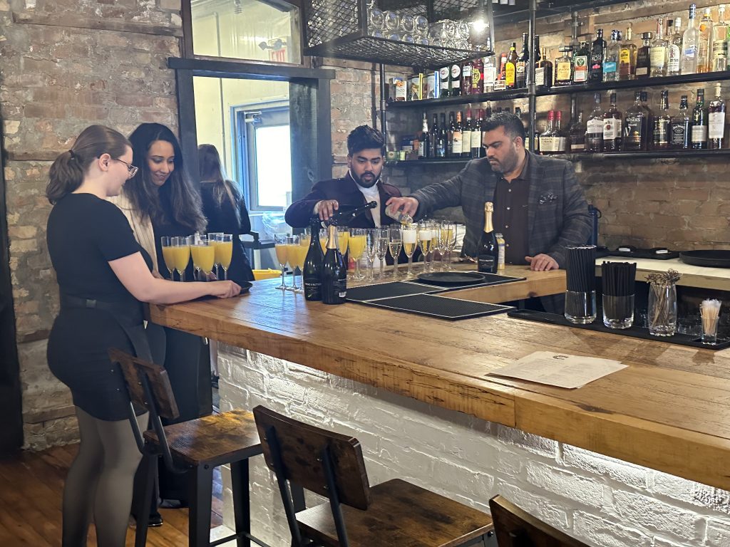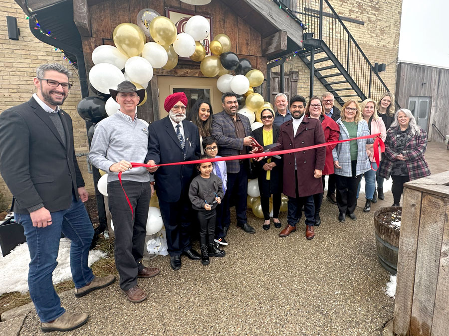 Drayton Chop House owner/operators Gaurav Parmer, left, and Vidit Gupta weild the sissors to cut the ribbon at the official opening of the restaurant on Feb. 1. Perth-Wellington MPP Matthew Rae, left, and Mapleton Mayor Gregg Davidson, second from left, were among the local officials, family members and well-wishers on hand for the opening. The popular downtown eatery, which closed over 18 months ago, was recently re-opened under the new management. Photos by Patrick Raftis