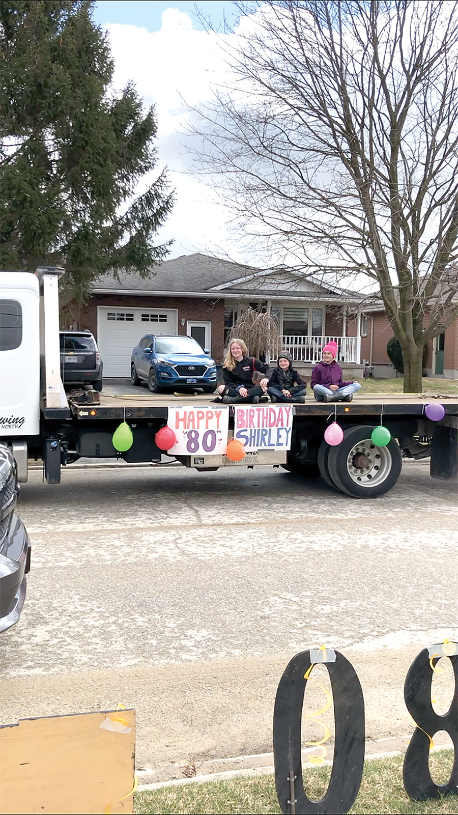 Birthday parade – An drive-by celebration was held for Shirley Bruce’s 80th birthday on March 27 in Mount Forest. Her actual birthday is March 31. A total of 34 cars and trucks participated in the event, including a tow truck float carrying some young well-wishers.