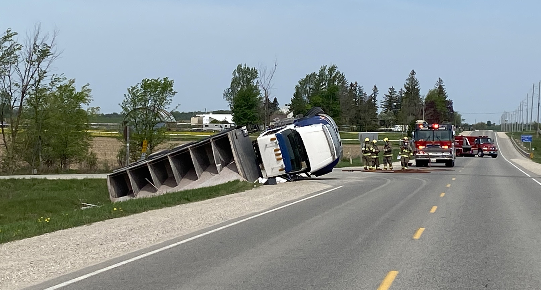 “It was reported that a straight truck loaded with granular fertilizer left the roadway and rolled over,” states a press release from the Wellington County OPP.