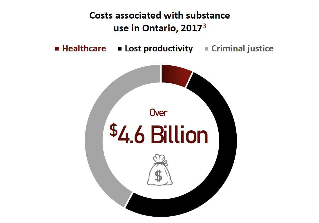 - the costs associated with substance use in Ontario (in 2017) top $4.6 billion, including health care, lost productivity and through the criminal justice system; and