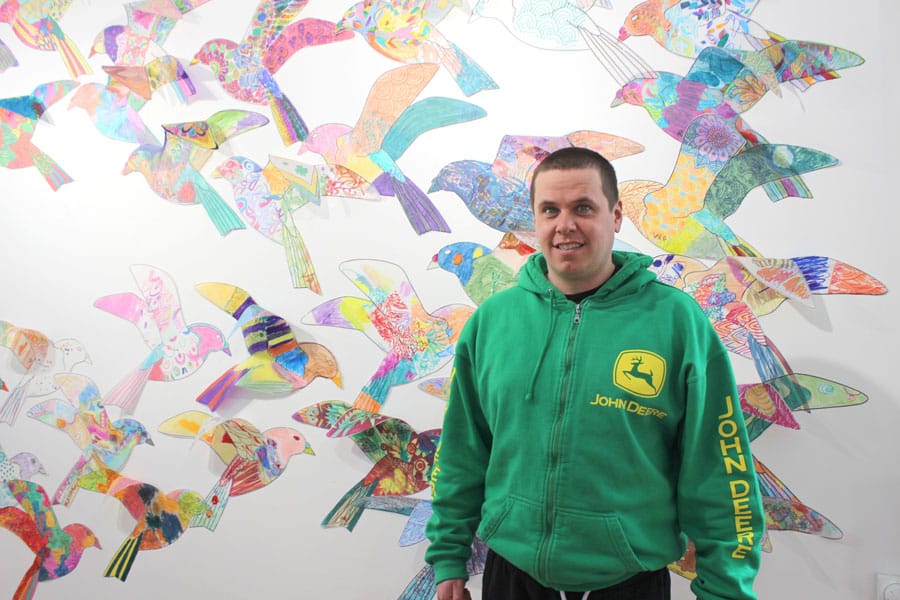 Paper mache birds hang from the ceiling, a flock of three dimensional birds are on one wall, and circular pieces depicting birds fly on vibrant horizons, all created by about 65 artists.