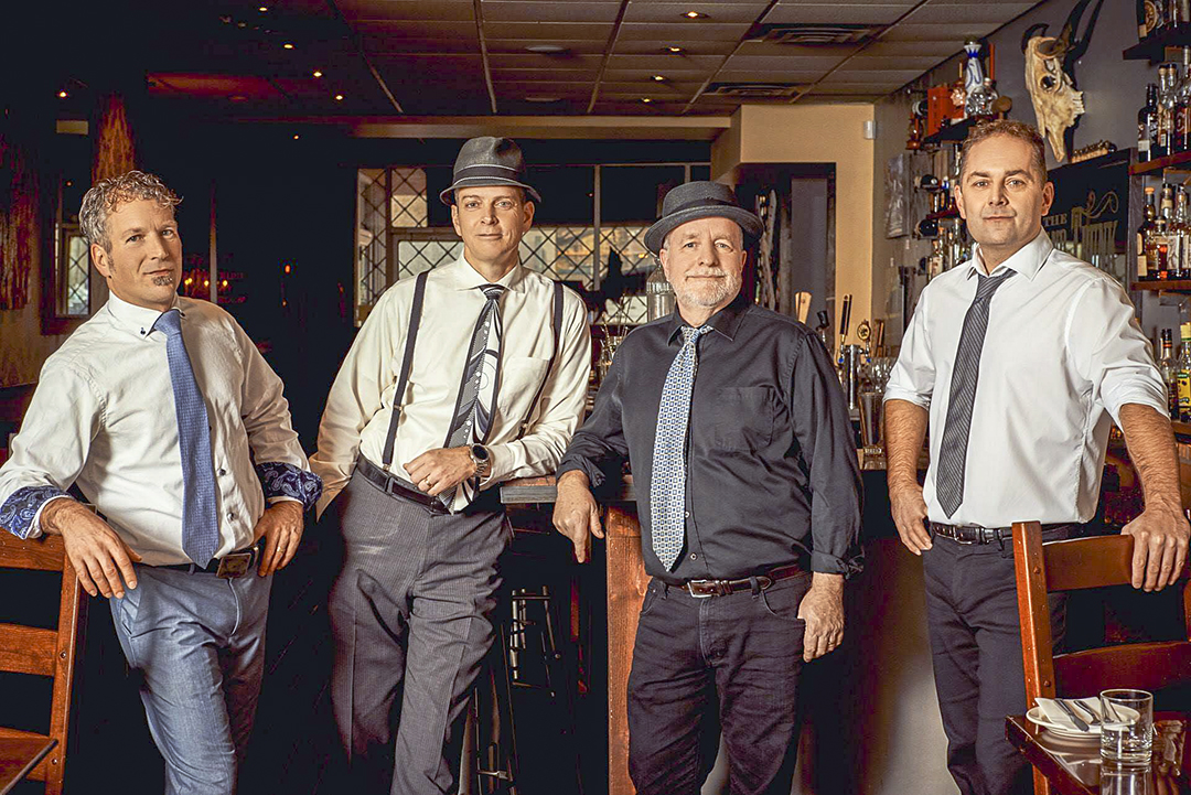 The quartet features saxophones, piano, guitar, drums and upright bass, with true three-part vocal harmony all decked out in fancy shoes and crisp button-downs.