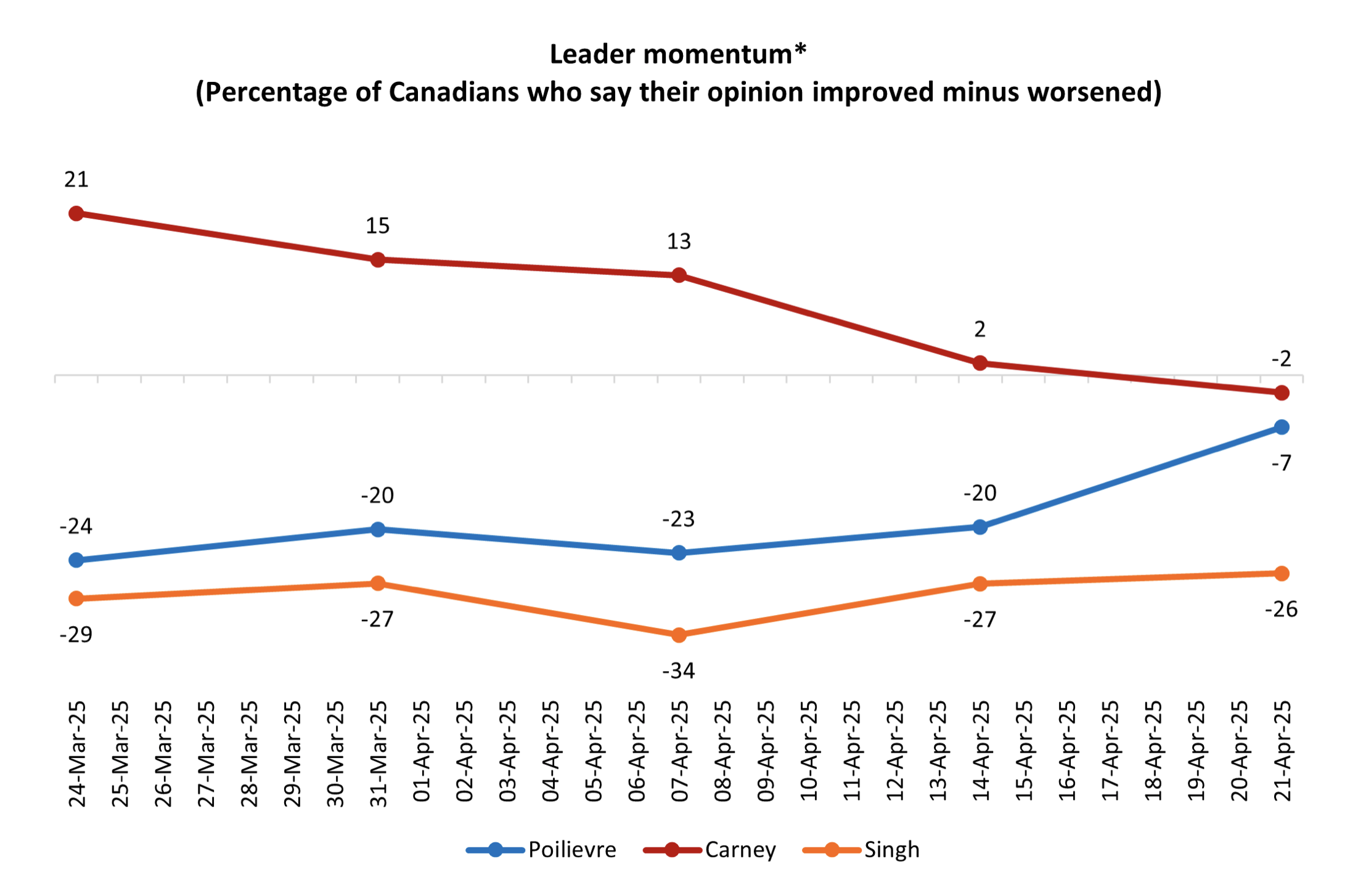 Meanwhile, Liberal leader Mark Carney scores a minus two this week, an inversion of his plus two before the debates.