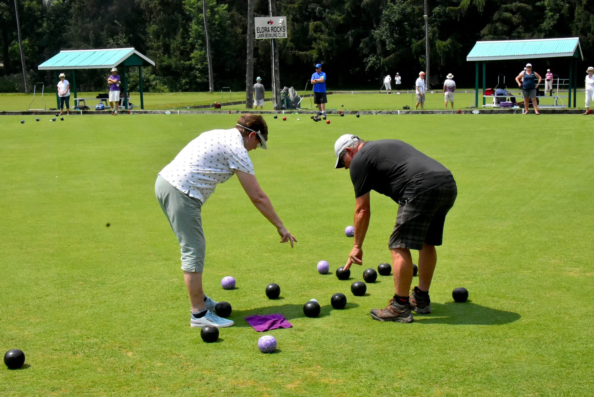 Photos by Bill LongshawFun day on the green – Members of the Elora Rocks Lawn Bowling Club experienced a beautiful day on July 25 as a start to their upcoming season. From left: second year member Donna Blom and new bowler Ron Armstrong counting points after an end.