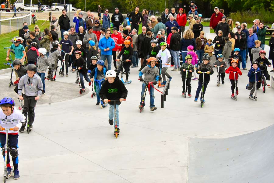 Time to ride - Following an official ribbon cutting, a large group of excited youths raced to try out the new Elora Skatepark.
