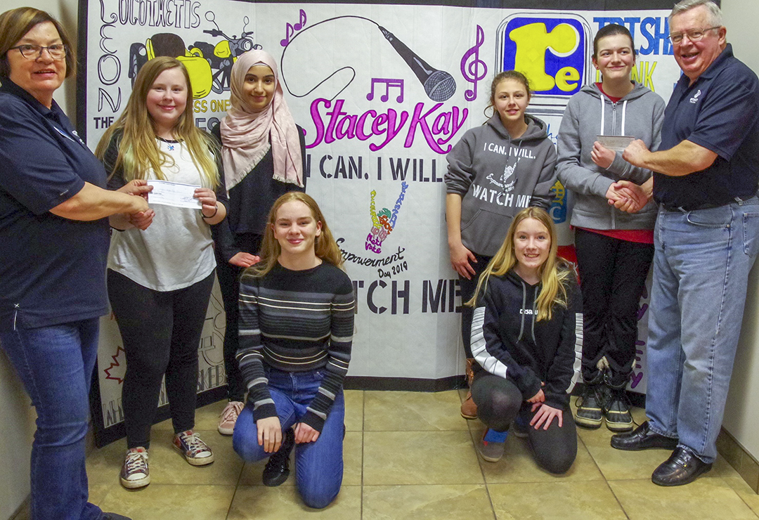 Optimist Clubs from Alma, Arthur, Centre Wellington, Guelph, Moorefield, Minto, Orangeville and Puslinch donated $15,000 to this year’s Empowerment Day event, hosted by Drayton Heights Public School at the Sleeman Centre in Guelph on May 2. Centre Wellington Optimists Lynn Bailey, left, and Jim Dandy, right, presented the cheque at a recent fundraising barbecue. Grade 7 and 8 students on hand to receive the cheques, from left, were: Ali Raynard, Nadia Meselmani, Clare Cashin, Bella Clemmer, Madison Hickey and Alexis Skerritt. The Optimists have sponsored Empowerment Day for four years. Submitted photo